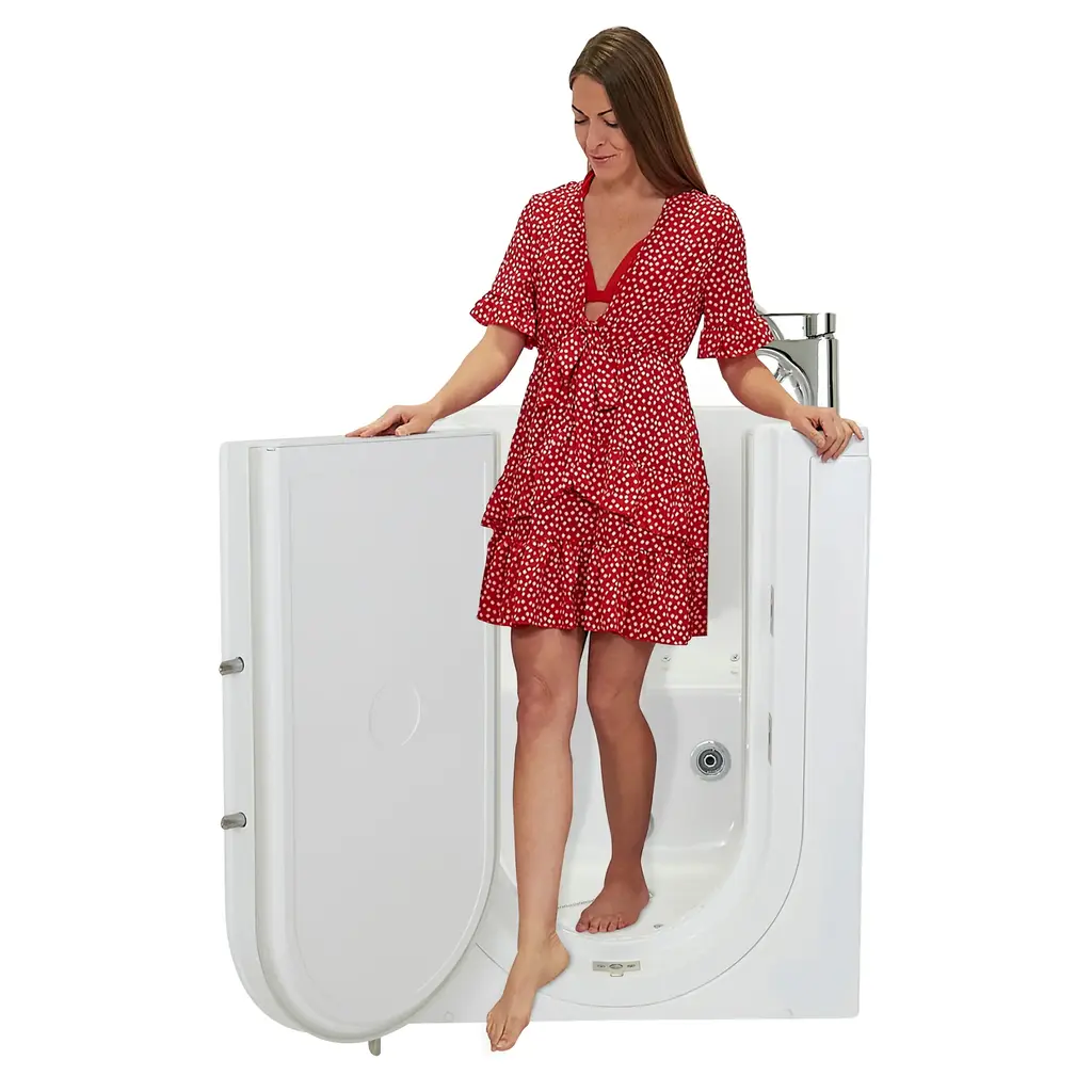 Ella Acrylic Walk-in Tubs are vacuum formed from a solid, long-lasting acrylic sheet. Under the acrylic shell facade is a rust proof, stainless steel frame reinforced with multiple fiberglass mesh and gelcoat layers to ensure the durability of the tub's structure. Ella's Front Entry Walk-In Tubs main feature is the U-Shape Outward Swing Door made with industrial grade durable plastic composite material with a decorative tempered glass front screen to conceal the mechanical door lock system. This door is engineered to open outward, facilitating easier access upon entering and exiting. The outward swing also creates more interior space, which allows bathers to effortlessly sit into the molded seat, pull the door closed and lock it. Ella U-Shape outward swinging door uses a gear and shaft driven 3-latch door lock that edges out our competition, who typically use a single latch/lever system. A 3-latch door system creates a more secure and watertight door seal, providing you with a safe, leak-free bathing experience. The Front Entry comes with our Single 2" Drain with emergency pull up chain, consisting of two 2" outlets and an overflow. The 2-Piece fast-fill faucet has 2 pieces: a mounted faucet and a pull out multi-functional hand shower. The lever to control the temperature of the water is included on the mounted faucet, as well as a button that can divert the water flow between the mounted faucet and hand shower. It has a fill rate of 16 GPM, based on plumbing conditions.Options- -The Hydro Massage System includes thirteen (13) strategically placed hydro jets in order to deliver optimal therapeutic relief. Eleven (11) upper fixed jets work to provide relief to your back, hips and thighs, while two (2) lower adjustable jets massage your calves.-Air Jet Massage System includes an air pump with a 3-speed variable push control, strategically positioned air jets for optimal therapeutic relief, and an auto-purge to maintain an air system free of any build ups. Ten (10) upper, fixed flat jets work to provide relief to your back, hips and thighs, while an additional six (6) floor jets located in the lower foot area deliver a gentle massage to your feet and legs. -The Air + Hydro massage package includes LED chromatherapy with multicolor LED lights that can be cycled through various colors and illuminates the entire water to creating a relaxing and harmonious experience.
