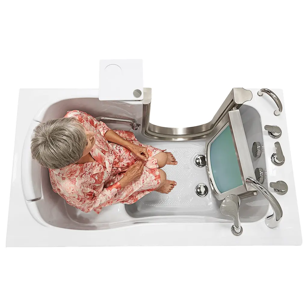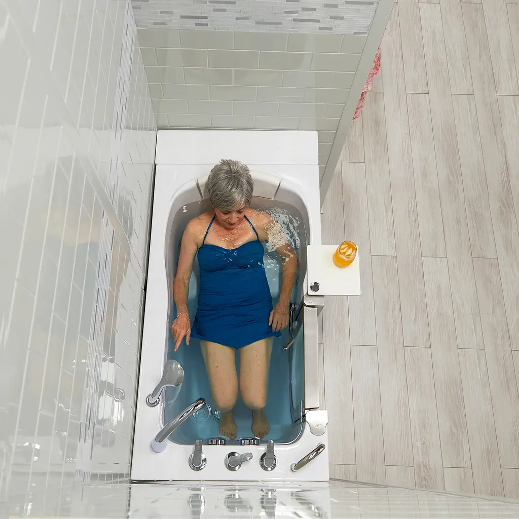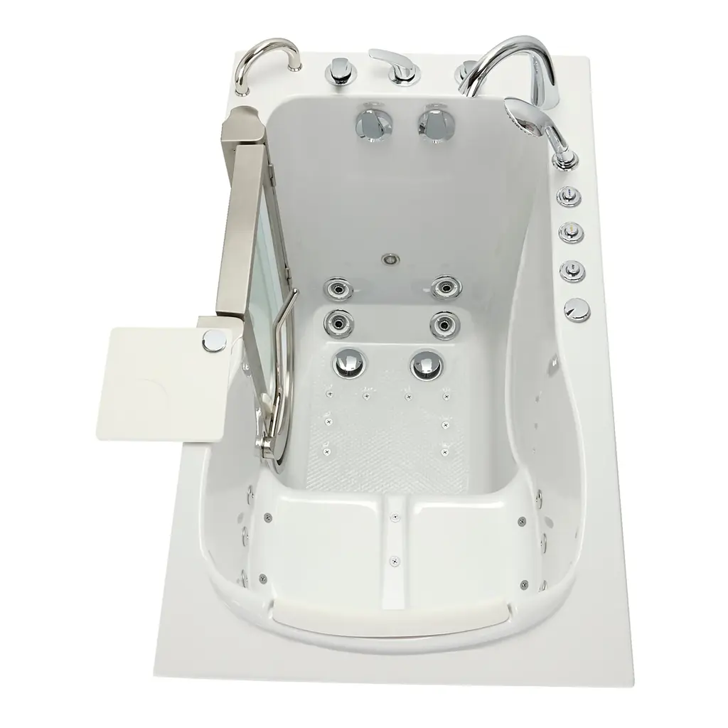 Ella Acrylic Walk-in Tubs are vacuum formed from a solid, long-lasting acrylic sheet. The non-porous material in white gloss finish is easy to clean and impermeable to mold and mildew. Under the acrylic shell facade is a rust proof, stainless steel frame reinforced with multiple fiberglass mesh and gelcoat layers to ensure the durability of the tub's structure. Ella's Petite Walk-In Tubs main feature is the door made from a custom brushed stainless steel and a frosted tempered glass window to give a sleek, contemporary look. The door swings into the bathtub to allow the bather to enter and exit the tub. The lever lock creates a secure and watertight door seal, providing you with a safe, leak-free bathing experience. Our patented 360° swivel tray allows customers to place anything from a drink to a book for convenient use while bathing. The Petite comes with our unique Ella Dual Drain Technology (DDT) consisting of two 2" gravity driven drains with four 2" outlets, 2 overflows and 2 openers, allowing a fast, reliable drain. The 2" drain outlets can be connected to the standard 1 ½" house drain with a T or Y fitting and piping selected by a professional plumber. The drain pipe configuration and selection of the pipes and fittings is up to the homeowner or licensed plumber. However, for the most efficient drain, please consider connecting to all 4 ports and to a 2" house drain if possible. Options- -The Petite walk-in tub has sixteen (16) strategically placed hydro jets in order to deliver optimal therapeutic relief. Ten (10) upper fixed jets work to provide relief for your back, hips and thighs, while six (6) lower adjustable jets massage your feet and calves. The Hydro Massage System includes: a hydro pump with an in-line water heater, an eco-friendly ozone sterilization system, a hydro massage intensity control dial, and a strategically positioned hydro jet system for targeted and effective massaging.-The Petite walk-in tub has sixteen (16) strategically placed air jets in order to deliver rejuvenating therapeutic relief. Eight (8) upper, fixed flat jets work to provide relief to your back, hips and thighs, while an additional eight (8) jets located in the lower foot area deliver a gentle massage to your feet and calves.The air massage system includes an air pump with a 3-speed variable push control, strategically positioned air jets for optimal therapeutic relief, and auto-purge to maintain an air system free of any build ups.-The Air + Hydro massage package includes LED chromatherapy with multicolor LED lights that can be cycled through various colors and illuminates the entire water to creating a relaxing and harmonious experience. Choose from a 2 piece fast fill faucet at 16 GPM or a 5 piece fast fill faucet at 18 GPM. A heated seat is available for comfortable entry into the tub and while waiting for it to fill.