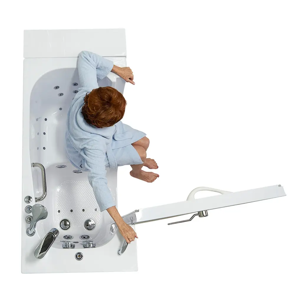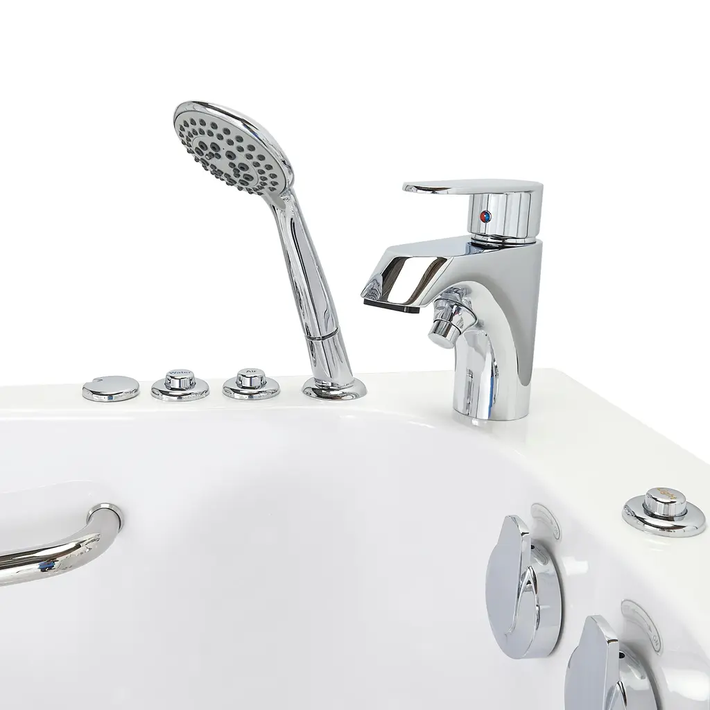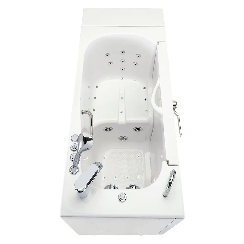 Measuring 26" wide and 52" long, the Transfer26 is the most narrow model amongst our wheelchair accessible walk-in bathtubs. Due to its smaller size, the Transfer26 is recommended for petite to average body types and it's a great option for smaller bathrooms. In addition, not only is this tub a space saver due to its size, it is also a water saver! With a wide L shaped barrier-free sidewall design, bathers can easily transfer from the wheelchair into the comfortable 19" molded seat. This model is also very popular amongst non wheelchair users who are seeking effortless slide-in access into the seat. The large 36" L shape outward swing door is made out of a light aluminum frame and a white acrylic cover that elegantly matches the glossy acrylic finish of the tub. The Transfer26 is the perfect solution for anyone in need of a safety tub that offers convenience, comfort, handicapped accessibility, and functionality. The Transfer 26 comes with Ella's unique Dual Drain Technology (DDT) consisting of two 2" gravity driven drains with four 2" outlets, 2 overflows and 2 openers, allowing a fast, reliable drain. The Hydro Massage System includes: a hydro pump with an in-line water heater, ozone sterilization system, hydro massage intensity dial control, and strategically positioned hydro jet. The Transfer26 has 13 strategically placed hydro jets: 7 upper fixed jets provide relief to your back, hips and thighs, and 6 lower adjustable jets massage your feet and calves. The 2-Piece fast-fill faucet has two (2) pieces: a mounted faucet and a pull out multi-functional hand shower. The lever to control the temperature of the water is included on the mounted faucet, as well as a button that can divert the water flow between the mounted faucet and hand shower. It has a fill rate of 16 GPM (gallons per minute), based on plumbing conditions.Options- -The Hydro Massage System includes thirteen (13) strategically placed hydro jets in order to deliver optimal therapeutic relief. Seven (7) upper fixed jets work to provide relief to your back, hips and thighs, while six (6) lower adjustable jets massage your feet and calves. -Air Jet Massage System includes an air pump with a 3-speed variable push control, strategically positioned air jets for optimal therapeutic relief, and an auto-purge to maintain an air system free of any build ups. Eleven (11) upper, fixed flat jets work to provide relief to your back, hips and thighs, while an additional six (six) floor jets located in the lower foot area deliver a gentle massage to your feet and legs. Additionally, two (2) of the eight (8) upper jets are bidet jets. -The Air + Hydro massage package includes LED chromatherapy with multicolor LED lights that can be cycled through various colors and illuminates the entire water to creating a relaxing and harmonious experience.