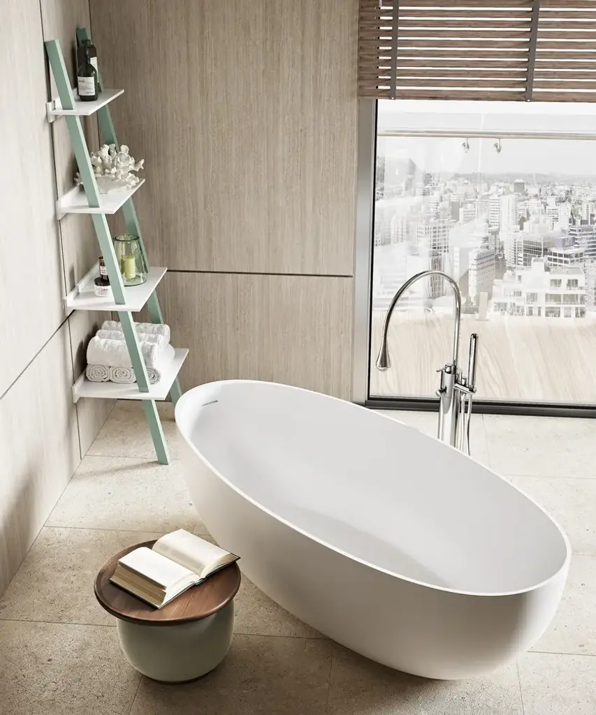 GISELLE is an oval freestanding Bathtub in White Stonage. Drain and siphon included.