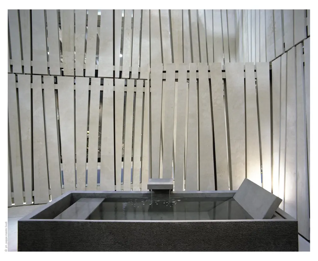 The Kobe tub is part of the "stone likes water" collection designed by Hikaru Mori, this collection originates from the contemporary reinterpretation of the heritage of objects and environments in the Japanese thermal bath tradition: it is made of natural stones, essential shapes and stimulating surfaces conceived to exalt their privileged relationship with water. The "esterna" tub comes with an exterior drain designed to gather the overflow of water.The standard finishes are: "string" or rigato for the exterior and honed for the interior.