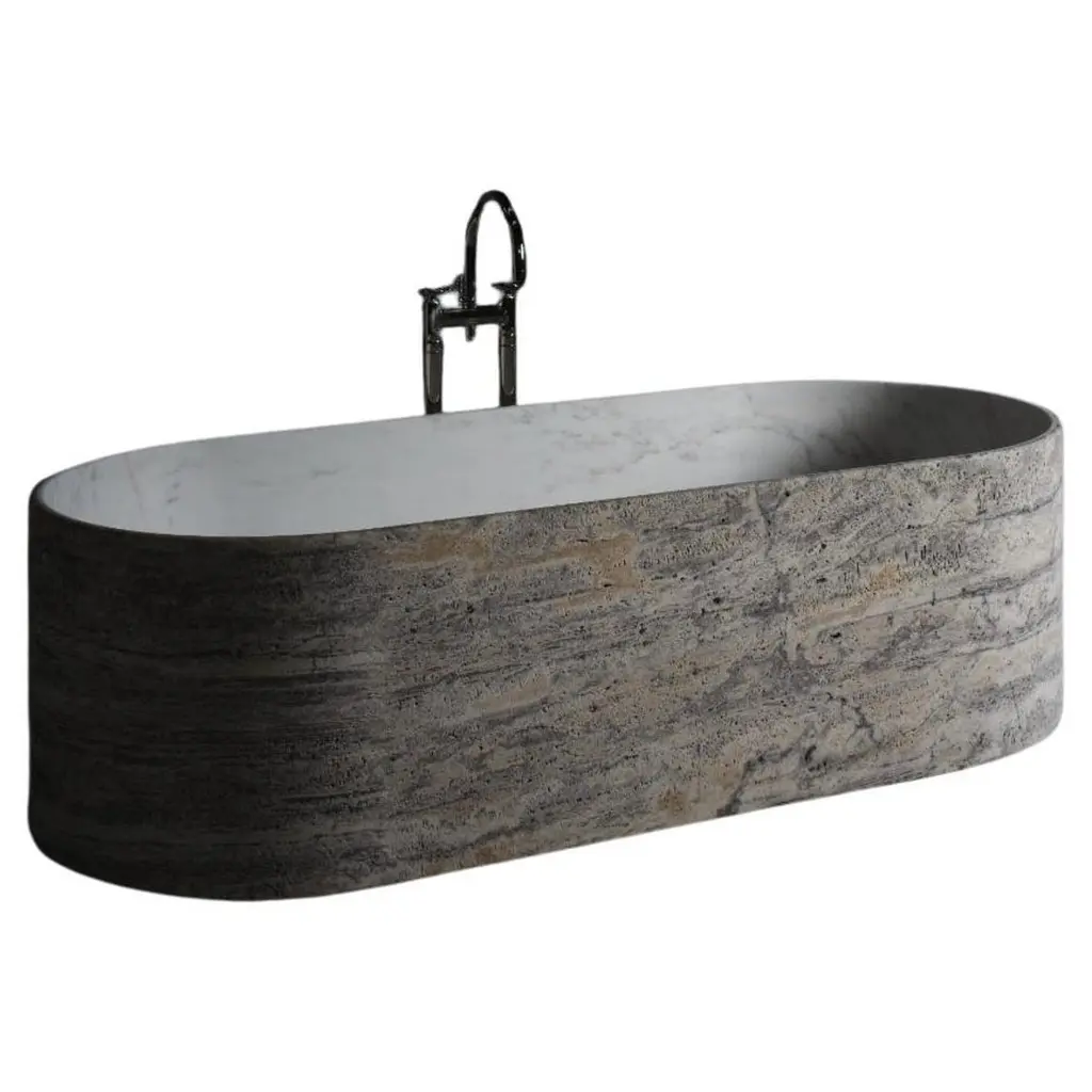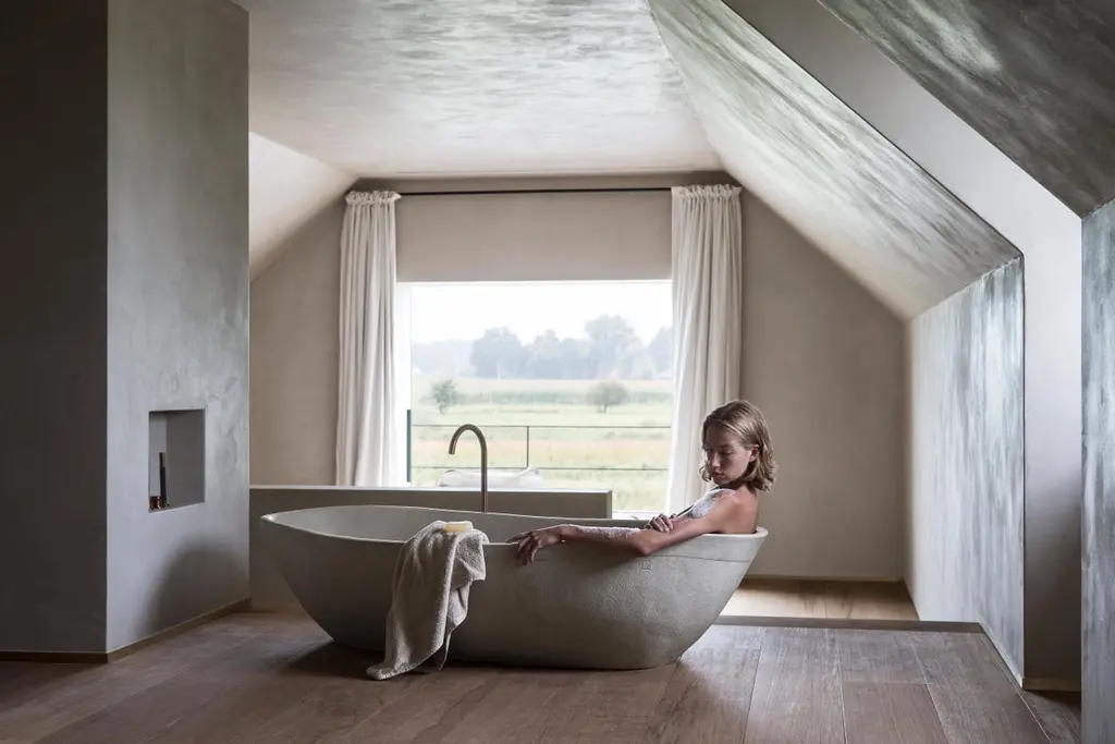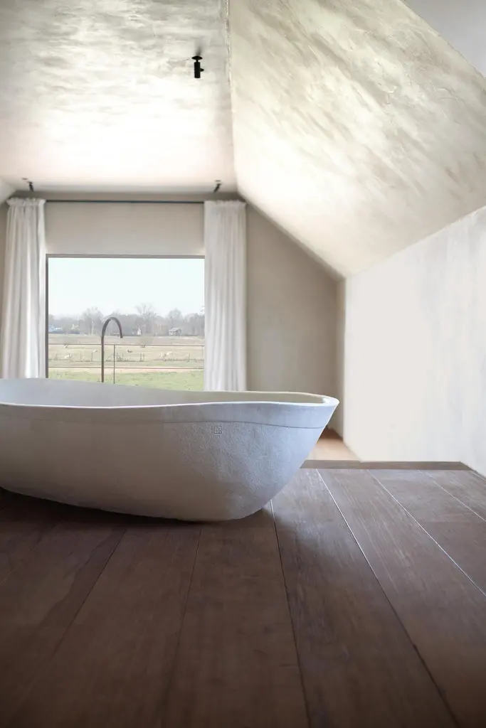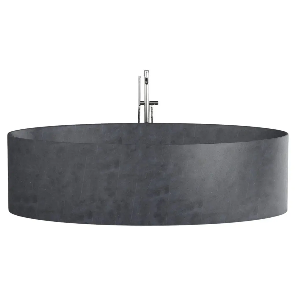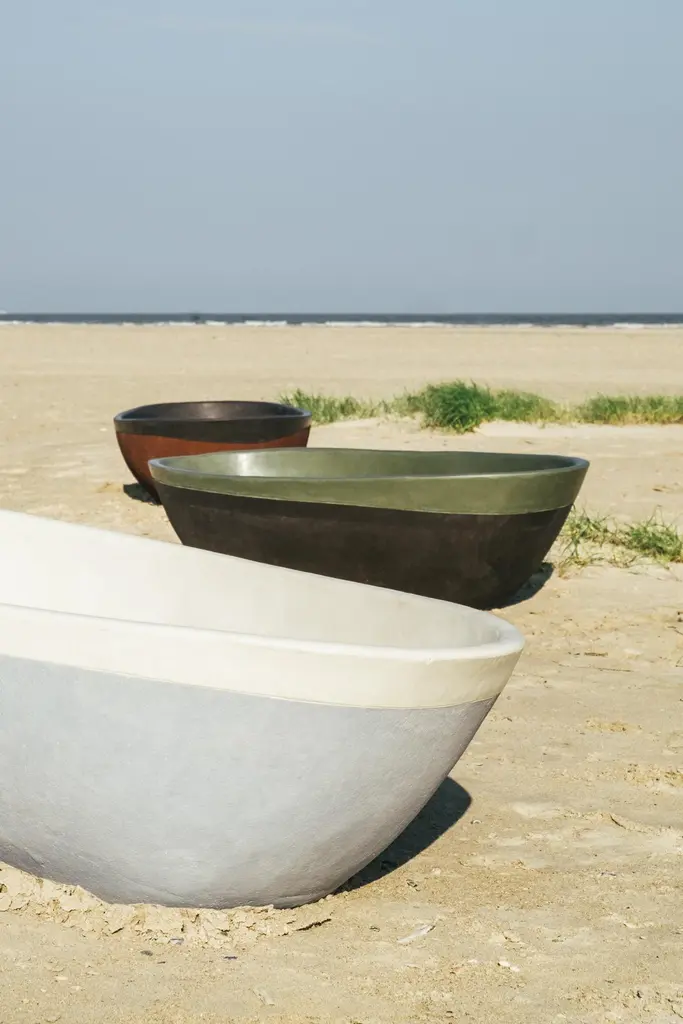 Large clay bathtub by Studio LohoDimensions: D 90 x W 160-165 x H 42 cmMaterials: clayOther colors and raw or smooth exterior available.Available in 4 sizes: W 160 x H 42(Large), W 160 x H 53(Large High), W 180 x H 42(X-Large), W 190 x H 53(X-Large High)The baths are entirely made of clay and are available in a wide range of colours or can be produced bespoke. The exterior of the clay can be raw or smooth according to preference, the interior of the baths is finished with a layer of smooth, silky lime plaster for maximum comfort. Due to the production process every piece is unique in size and form.Studio LoHo is a Belgian design office located in Bruges, Belgium. Founded in the autumn of 2017 by Karel Loontiens and Jo Hoeven, the studio focused from the beginning on high-end bespoke interior projects which forms an ideal matrix for product - and material design that is both innovative and durable. In current times there’s no more room for influx of disposable products, it is our studio’s goal to strive for design that will last and will be cherished for multiple generations.The introduction of the first collection “clay series” fully articulated the DNA of the newborn Studio and led to their international breakthrough. The appreciation of materials reflects their unique view on interior design with a strong and recognizable signature. Soon after, the collection was expanded on request by other architects and designers with new sinks and bathtubs.Other collections of lighting, sofa’s and tables followed. While not only paying attention to the actual design, the studio concentrated also on the production process to be lean and therefore guarding the cost structure. This resulted in organizing the production process under their own supervision.