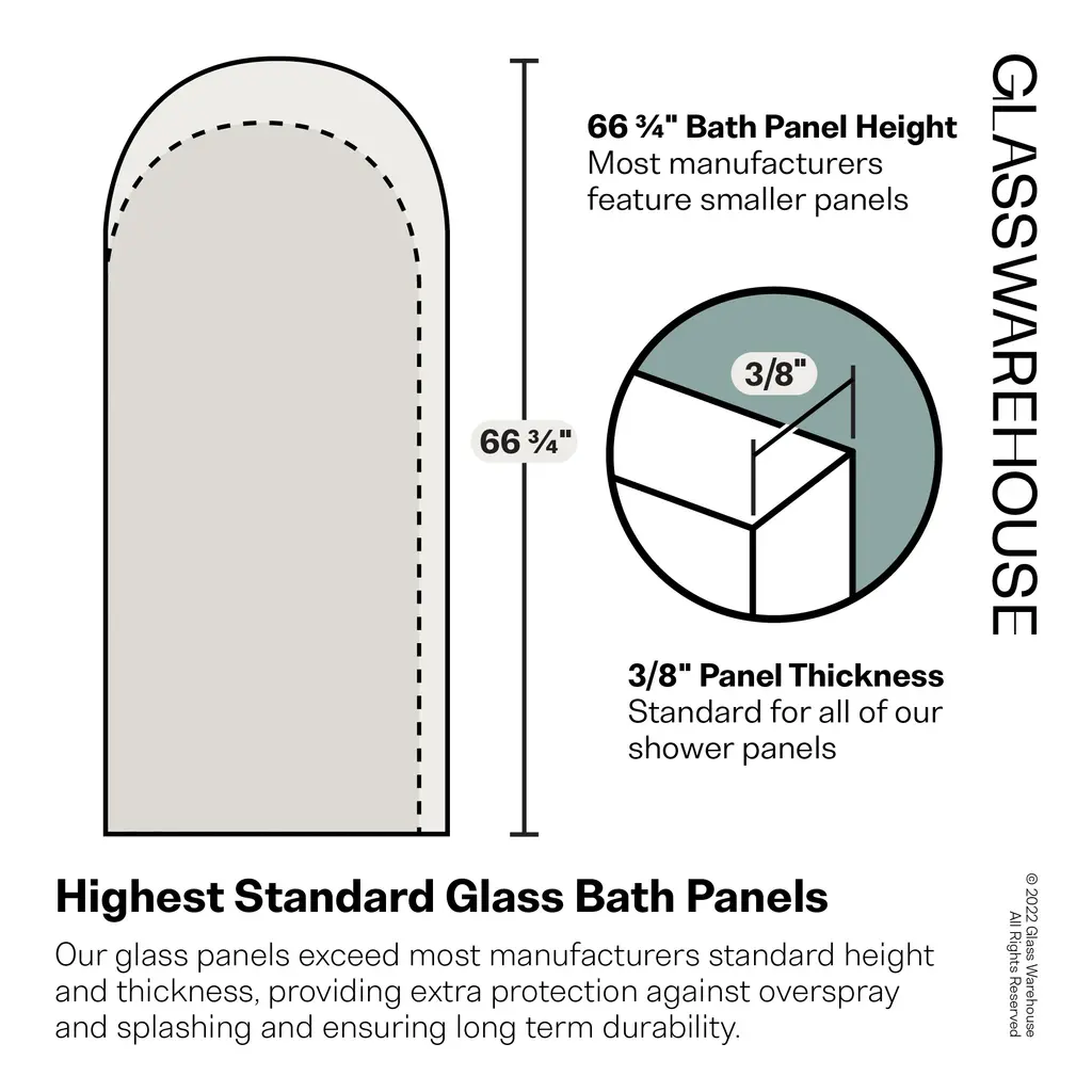 The curved edges of the Venus, our arched fixed bathtub panel, add a sense of flow to your design aesthetic, creating an elegant softness of form. Taller than most competitor shower enclosures, our 3/8" tempered frameless glass panels come in a standard 66.75" height. Glass is treated on both sides with EnduroShield coating, which aids in repelling water and soap residue, allowing the panels to be fully reversible. In addition, our superior quality solid brass hardware is available in a variety of color finishes to suit any bathroom. With an extensive range of fixed shower panel sizes available, the Venus by Glass Warehouse features premium frameless glass, which enhances the light in your bathroom. At the same time, the design's extra height adds a high-end, custom-made feel.