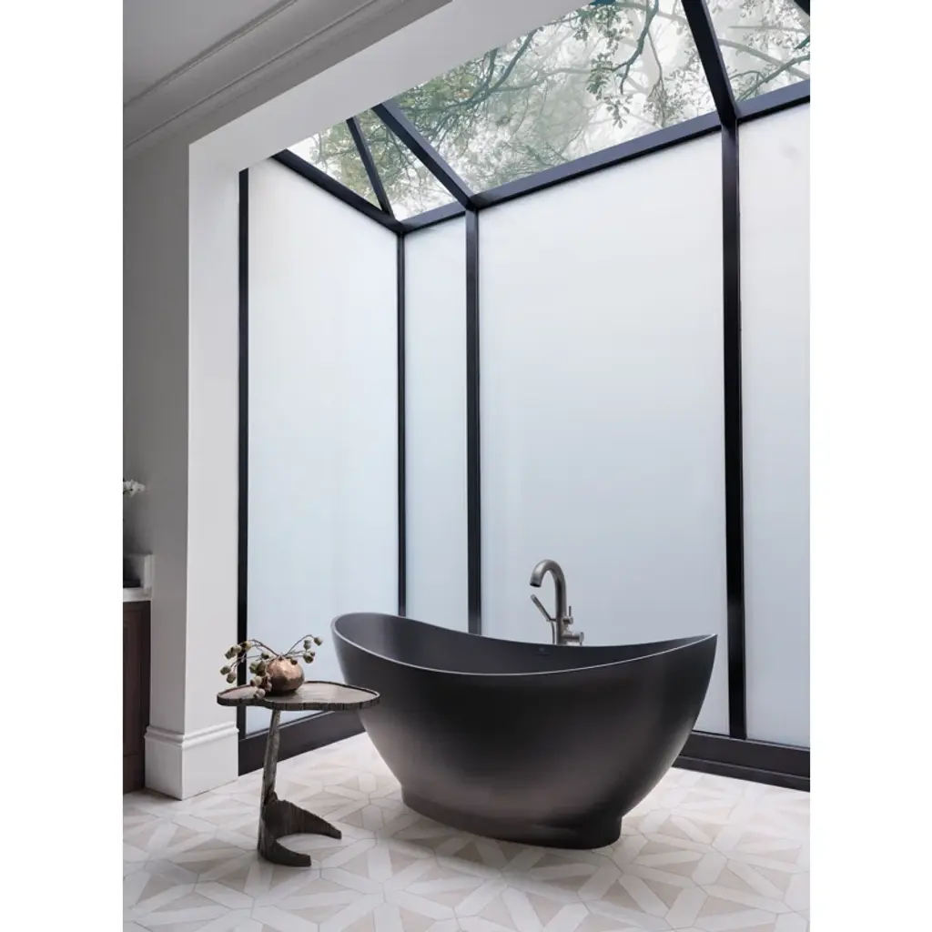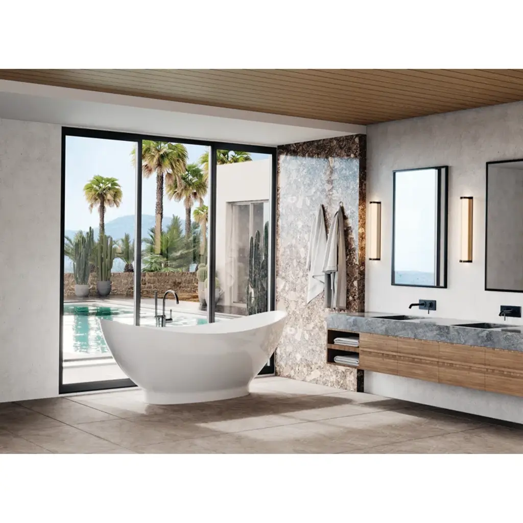 The freestanding Coachella tub redefines bathing as an ethereal experience. Inspired by California's prolific mid-century modern design found in the desert, its fluid form unfolds like butterfly wings on both sides for optimal comfort. Integrated lumbar support cradles the body, while a seamless integral pedestal elevates the bath to new heights. Paying homage to the spirit of openness and creativity reflected in the modernist ethos, Coachella is made from a HydroLuxe SS™ tub.