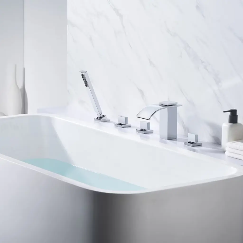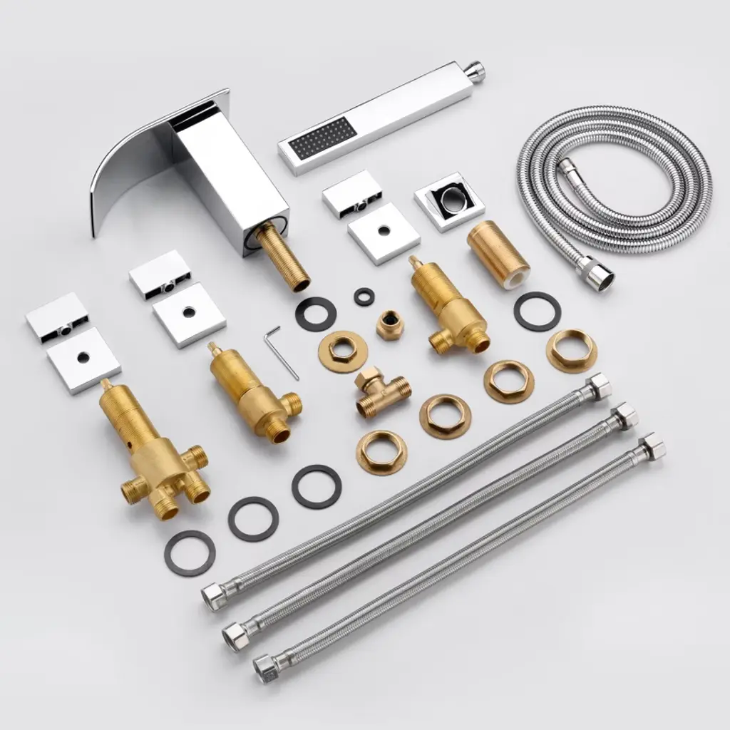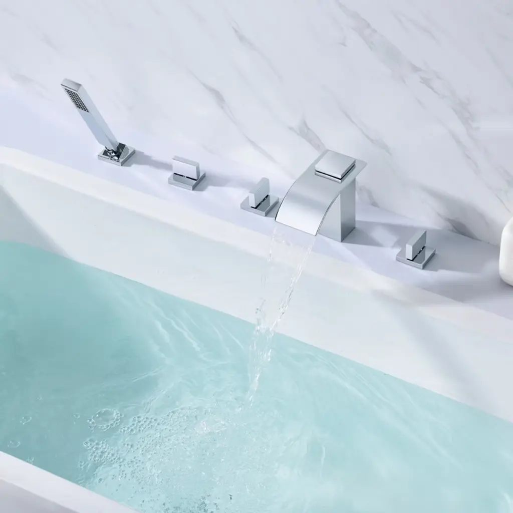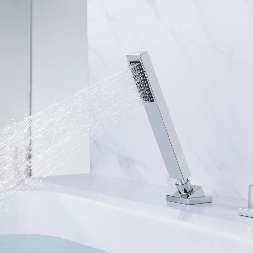 This is a Sumerian modern Roman tub faucet with a minimal, streamlined design and an elegant brass hand shower that makes bathing a truly pleasurable experience. This 3 handles bathtub faucet will perfectly suit bathrooms with modern decor. The wide spout features a dramatic waterfall effect, and with a 6.82 GPM high flow rate, it fills up your bathtub in a very short time. 5-hole installation. This tub faucet requires low maintenance and is easy to clean. This tub faucet listed in the CEC modernized appliance efficiency database system and ECPA DOE List, has WaterSense certification and is compliant with the standard: EPA WaterSense specification for showerheads(version 1.1, July 26, 2018), 1.8GPM (6.8L/MIN) showerhead flow rate. This tub fillers also has ICC-ES PMG certification and is compliant with standard: ASME A112.18.1/CSA B125.1-2018, plumbing supply fittings(the same standard as cUPC certification). Model: S2126CW-TAProduct Name: Waterfall Tub Faucets with Hand ShowerMaterial: Brass, 304 Stainless SteellFinish: ChromeFlow Rate: 6.82GPM@60PSI Welcome to SUMERAIN! We are dedicated to showcasing our proficiency and unwavering dedication in crafting superior faucets. Our team of talented designers and engineers exert relentless efforts to conceive groundbreaking and aesthetically pleasing faucets that flawlessly amalgamate style and practicality.From sleek and modern designs to classic and timeless styles, we offer a wide range of options to suit various preferences and interior design themes.. We believe that every customer deserves a faucet that not only performs flawlessly but also adds a touch of elegance to their space. About this item specificities 1.Roman tub faucets with hand shower, handy for rinsing down the tub or just rinsing off after a bath.2.Brass construction of roman tub faucets body and handles ensures reliability. 3.5 Holes deck mount roman tub faucet mounts directly to the tub fixture.4.Roman tub faucet brushed nickel with wide spout features dramatic waterfall effect, 6.82gpm@60PSI high flow rate.5.1/4 Turn disc cartridge. Tested to be drip free after 600,000 uses,covered under Sumerain's limited lifetime warranty.
