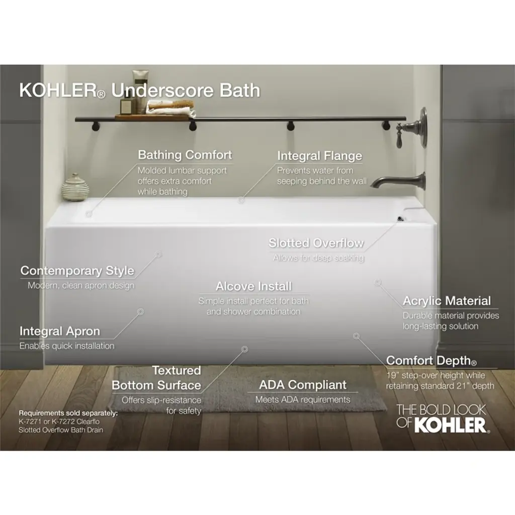Featuring a simple, crisp design, this Underscore alcove bath exudes refined style with contemporary flair. A slotted overflow drain allows for a luxuriously deep bath as you relax against the comfortable sloped backrest. This ADA-compliant bath offers a low step-over height for ease of access.