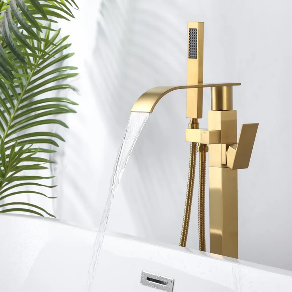 Wowow Brass Waterfall Single-handle Floor Mount Freestanding Bathtub Faucet With Hand Shower In Gold