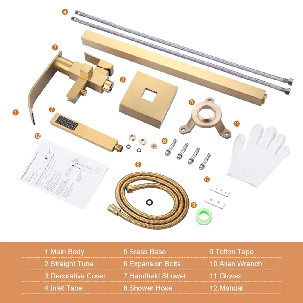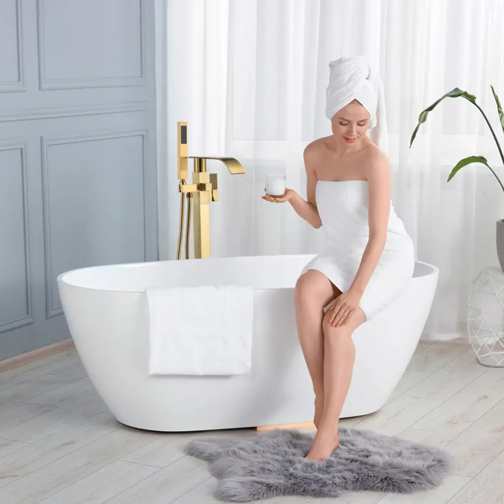 Upgrade your bathroom with our Brass Waterfall Floor Mount Freestanding Bathtub Faucet. Its elegant waterfall spout adds a touch of sophistication to your bathroom and fills the bathtub quickly and smoothly, creating a relaxing ambiance. Crafted from durable brass, this faucet is built to last, offering long-term use with excellent resistance to rust and corrosion. Controlling the water temperature is a breeze with the single-handle design. You can effortlessly adjust the hot and cold water to your preferred level. For added convenience, a hand shower is included, allowing you to target specific areas for cleaning and rinsing with ease. Stainless steel shower hose provides flexibility and reliability, preventing leaks. The water diverter knob lets you easily switch between the waterfall spout and hand shower for a customizable bathing experience. Whether you are looking to create a luxurious spa-like atmosphere or simply want a reliable and stylish bathtub faucet, this product is an excellent choice for your home.