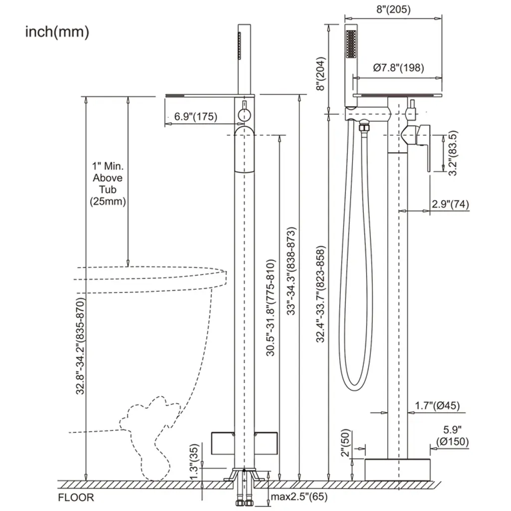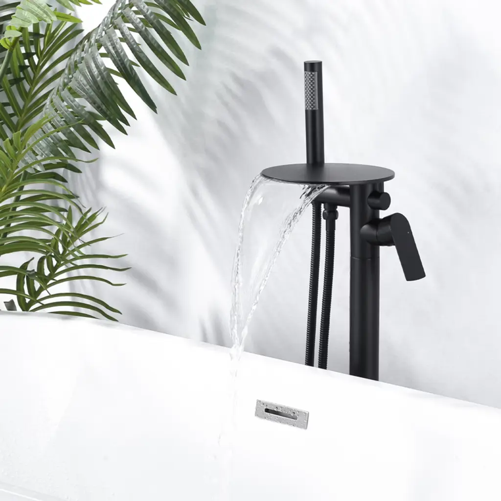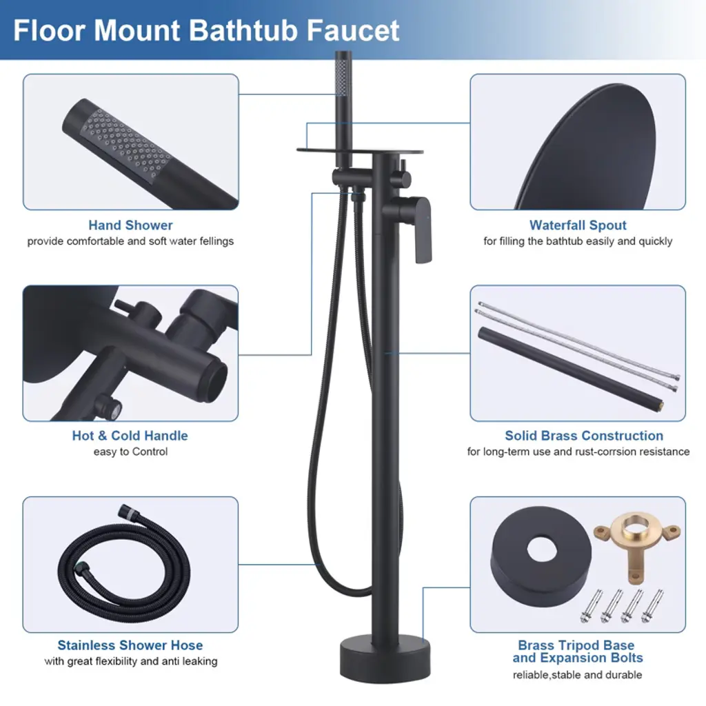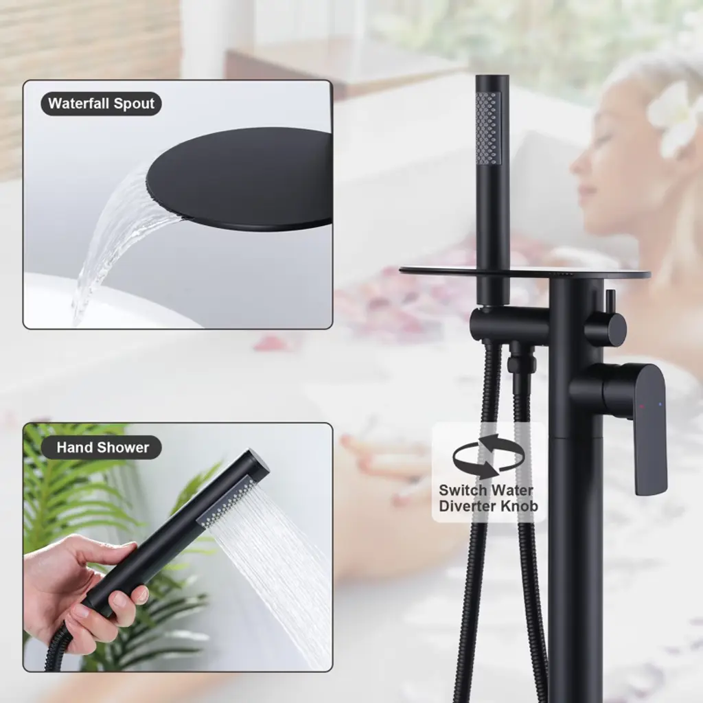 Upgrade your bathroom with the WOWOW floor-mounted bathtub faucet, a perfect combination of modern design and functional excellence. Featuring a wide waterfall spout, it fills your tub quickly and gracefully, creating a soothing spa-like experience at home. The included handheld shower provides flexibility for rinsing and daily cleaning. Built with solid brass construction, this faucet ensures long-lasting performance and easy maintenance. Ideal for contemporary freestanding tubs.