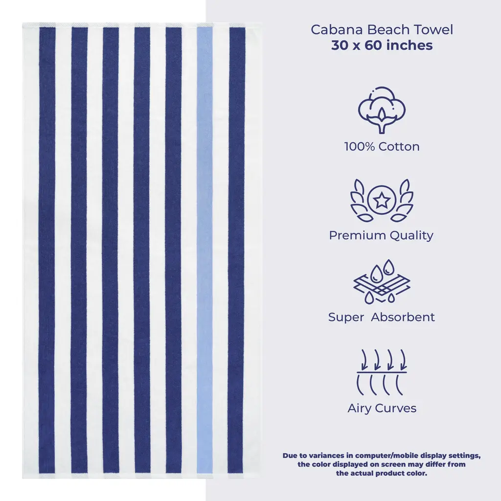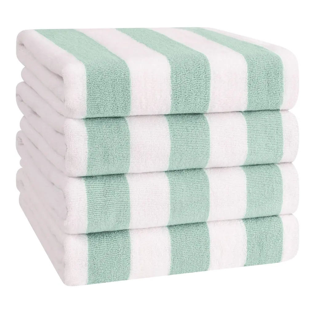 4 Pack Cabana Striped Oversized Beach Towel 30x60 Inch 100% Cotton, Soft Absorbent, Sand Free, Swim Towels Premium Quality 4 PACKED Beach and Pool Towels are Made with 100% Cotton Which is Soft and Absorbent. These Oversized Large Beach Pool Towels Measures are 30 in x 60 in. The Density of These Swim Towels are 450 GSM and Double Stitched on Long Sides. Therefore, it is Very Soft, Thick, Absorbent and Durable. These Beach Towels are certified with OEKO-TEX STANDARD 100 and Tested for Harmful Substances The striped design beach towels are woven with 100% Turkish cotton to make the towels extra soft, comfortable and dry quickly. Highly absorbent, yet light-weighted. Gives the body a soft and delicate touch while absorbing the moisture. Easy to care for, the cabana towels are machine washable and maintain their softness and integrity from one wash and dry cycle to the next.