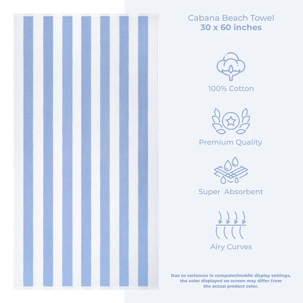 4 Pack Cabana Striped Oversized Beach Towel 30x60 Inch 100% Cotton, Soft Absorbent, Sand Free, Swim Towels Premium Quality 4 PACKED Beach and Pool Towels are Made with 100% Cotton Which is Soft and Absorbent. These Oversized Large Beach Pool Towels Measures are 30 in x 60 in. The Density of These Swim Towels are 450 GSM and Double Stitched on Long Sides. Therefore, it is Very Soft, Thick, Absorbent and Durable. These Beach Towels are certified with OEKO-TEX STANDARD 100 and Tested for Harmful Substances The striped design beach towels are woven with 100% Turkish cotton to make the towels extra soft, comfortable and dry quickly. Highly absorbent, yet light-weighted. Gives the body a soft and delicate touch while absorbing the moisture. Easy to care for, the cabana towels are machine washable and maintain their softness and integrity from one wash and dry cycle to the next.