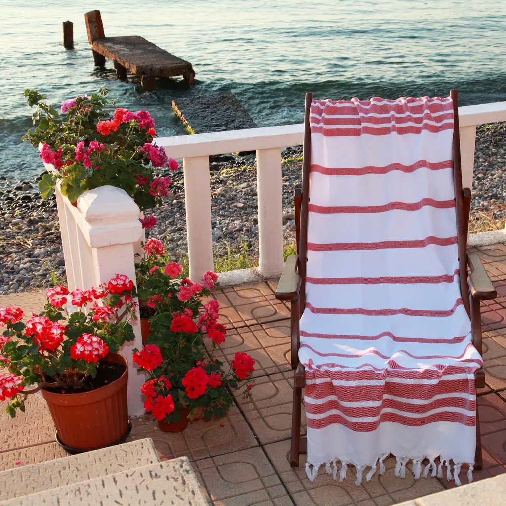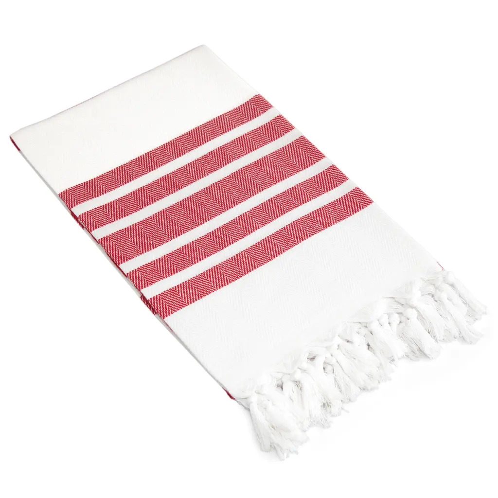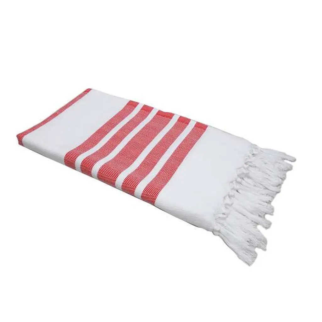This ultra-soft and extremely absorbent Fouta towel is 100-percent natural cotton hand-woven on ancient looms in Turkey. The herringbone weave Fouta towel is lightweight and generously sized, making it perfect to use for home and travel as a bath towel, beach towel or wrap. Pattern: Bold Stripe with wide border Construction: Hand woven with a herringbone weaveColor options: White/redMaterials: 100-percent Turkish cottonCare instructions: Machine washable, dry on low heatVersatile Fouta can be used as a picnic blanket, baby blanket, table cloth, sarong, shawl and as a chaise lounge cover.Fouta towel gets softer and more absorbent after each washMade in TurkeyDimensions: 70 inches x 35 inchesThe pestemals are hand-loomed and shipped in batches per loom, which may cause slight variations in color depending upon the dye lot
