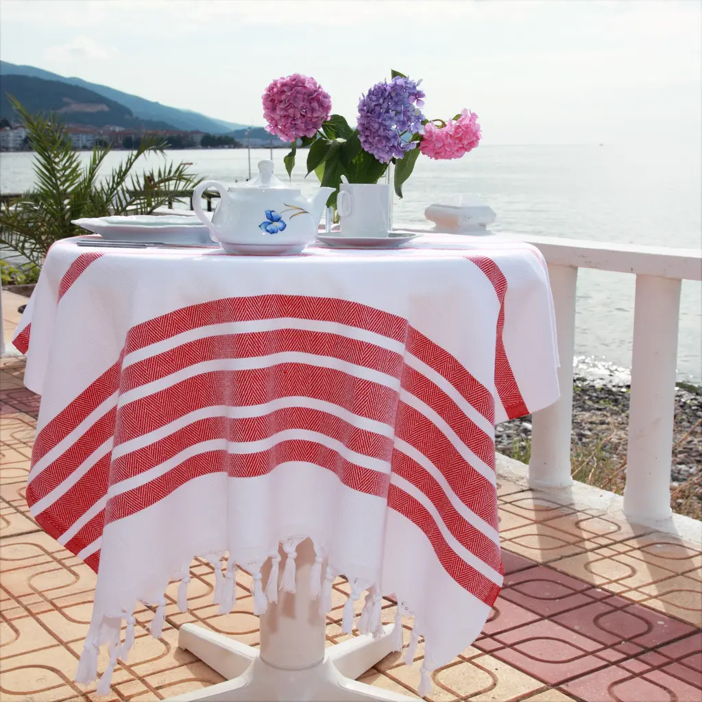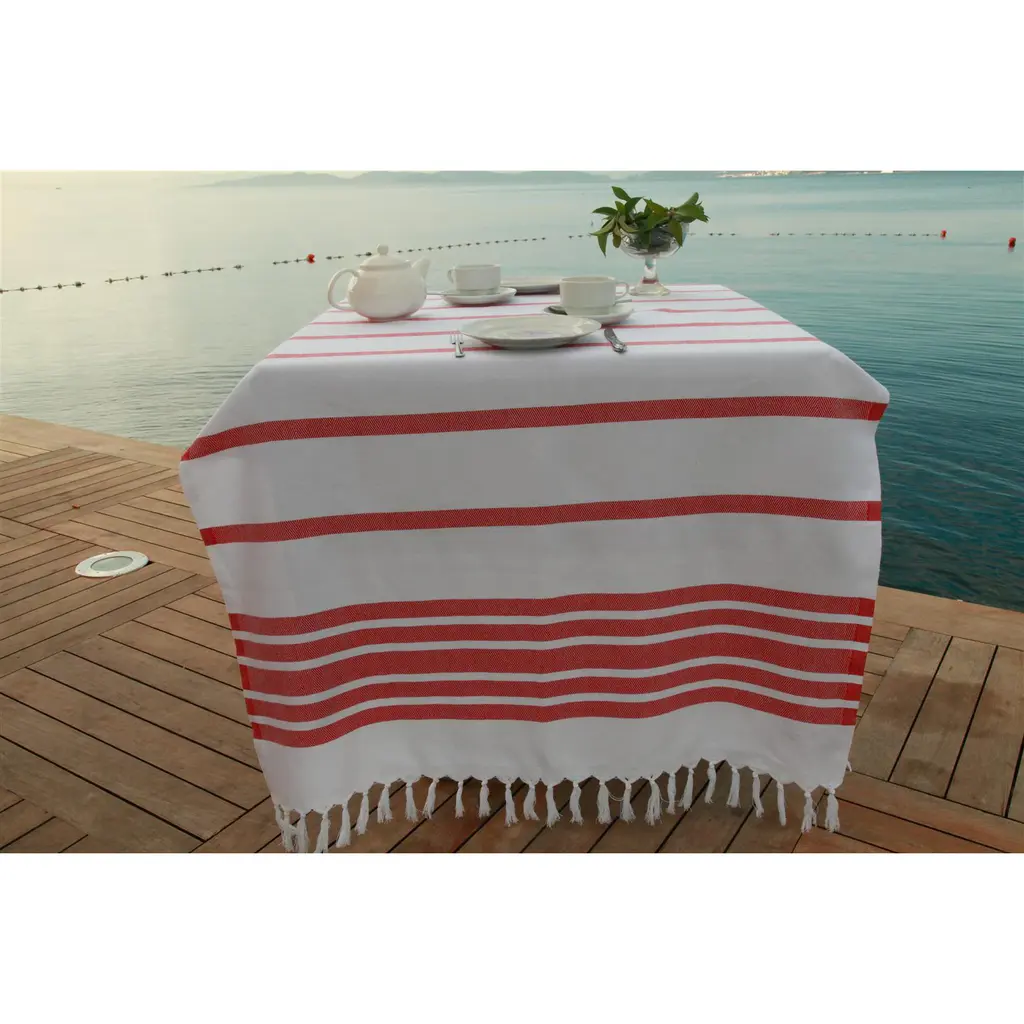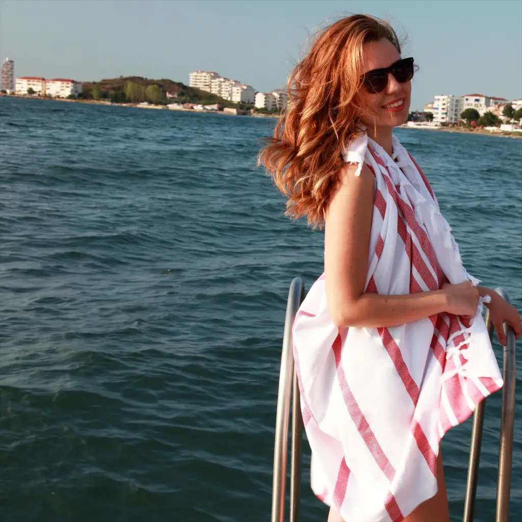 This ultra-soft and extremely absorbent Fouta towel is 100-percent natural cotton hand-woven on ancient looms in Turkey. The herringbone weave Fouta towel is lightweight and generously sized, making it perfect to use for home and travel as a bath towel, beach towel or wrap. Pattern: Bold Stripe with wide border Construction: Hand woven with a herringbone weaveColor options: White/redMaterials: 100-percent Turkish cottonCare instructions: Machine washable, dry on low heatVersatile Fouta can be used as a picnic blanket, baby blanket, table cloth, sarong, shawl and as a chaise lounge cover.Fouta towel gets softer and more absorbent after each washMade in TurkeyDimensions: 70 inches x 35 inchesThe pestemals are hand-loomed and shipped in batches per loom, which may cause slight variations in color depending upon the dye lot