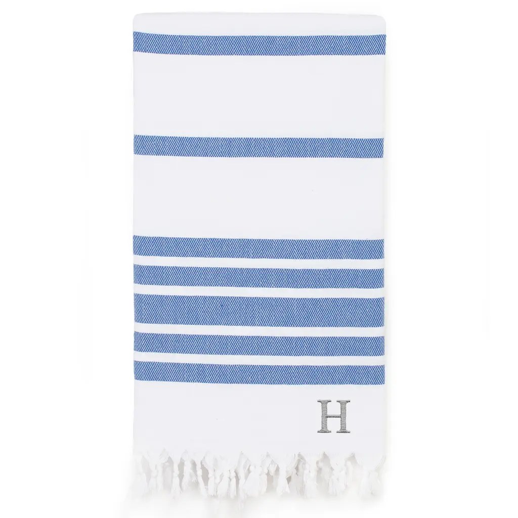 This ultra-soft and extremely absorbent herringbone weave fouta towel is made from 100-percent natural cotton hand-woven on ancient looms in Turkey. The beautiful beach and bath towel features is monogrammed with an embroidered letter of your choice for a special touch. Perfect for everyday use or travel, this eco-friendly design is light weight and fast drying for a truly dry feeling after you get wet. It is extremely durable and fits into your beach bag or suitcase with ease. The versatile towel can be used as a family beach blanket, sarong, shawl, fun table cloth, bed topper, throw on your sofa, bath towel and much more. Hand loomed with the best 100-percent Turkish cottonRoyal blue herringbone weave design is embroidered with a single letter of your choiceGreat for the beach, pool, lake and bathroomLight weight, easily fits into a beach bag or suitcasePerfect to use as a shawl, sarong or cover upMachine washableDimensions: 38 inches wide x 69 inches longDecorative fringe on 2 edges
