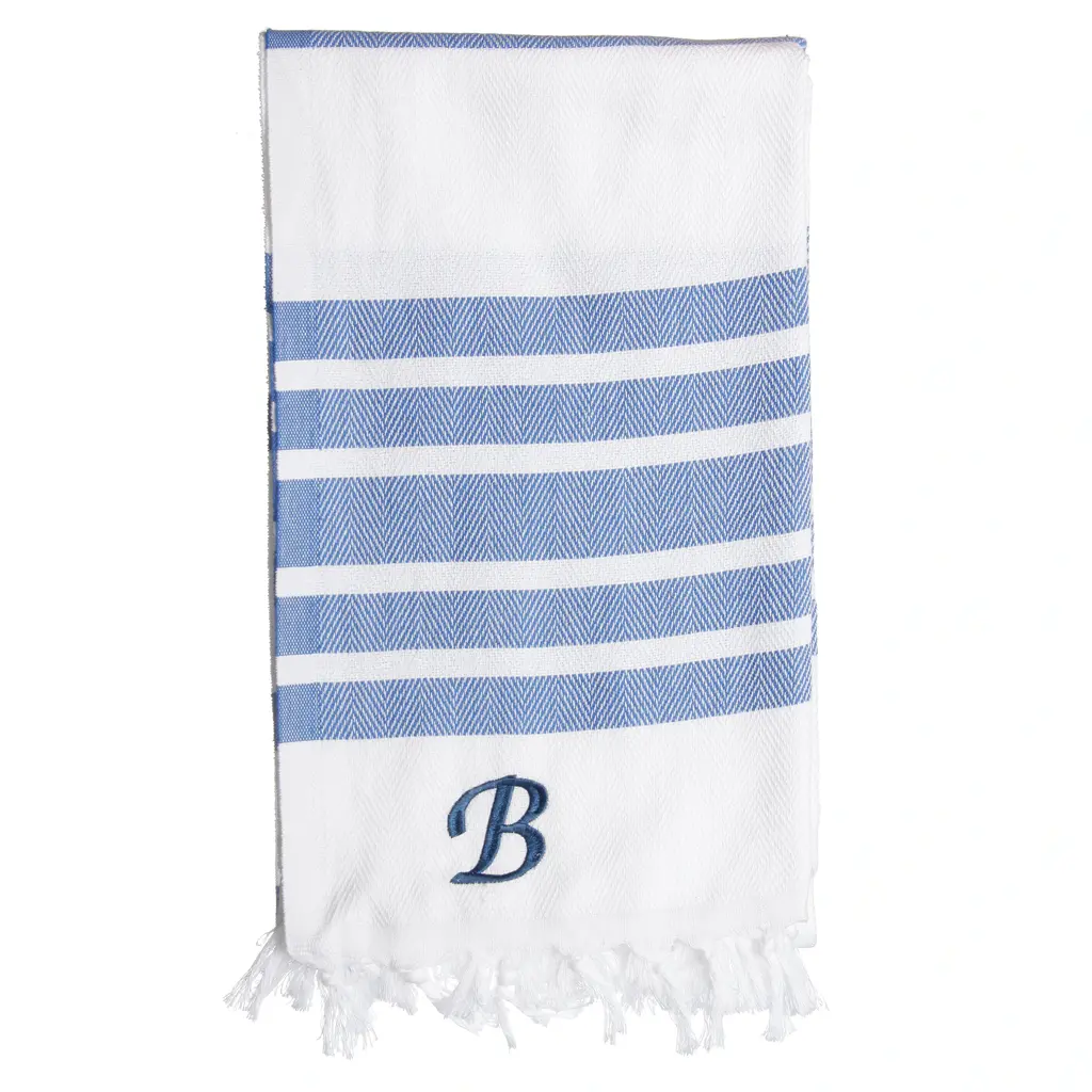 This ultra-soft and extremely absorbent Pestamel Fouta towel wrap is made from 100% natural cotton hand-woven on ancient looms in Turkey. Choose a single initial monogram on this lightweight and generously sized herringbone weave Fouta towel.Pattern: StripedType of cotton: TurkishConstruction: Woven with a herringbone weaveColor: White with blue stripes with navy monogramMaterials: 100% Turkish cottonCare instructions: Machine washableFouta towel was traditionally used in the Turkish bath housesCan be used as a lightweight fast drying towel, picnic blanket, baby blanket, table cloth, bathing suit sarong, shawl or as a chaise lounge coverGets softer and more absorbent after each washEco-friendlyFast dryingDoes not mildewMade in TurkeyDimensions: 35 inches wide x 70 inches longThe pestemals are hand-loomed and shipped in batches per loom, which may cause slight variations in color depending upon the dye lot.The digital images we display have the most accurate color possible. However, due to differences in computer monitors, we cannot be responsible for variations in color between the actual product and your screen.