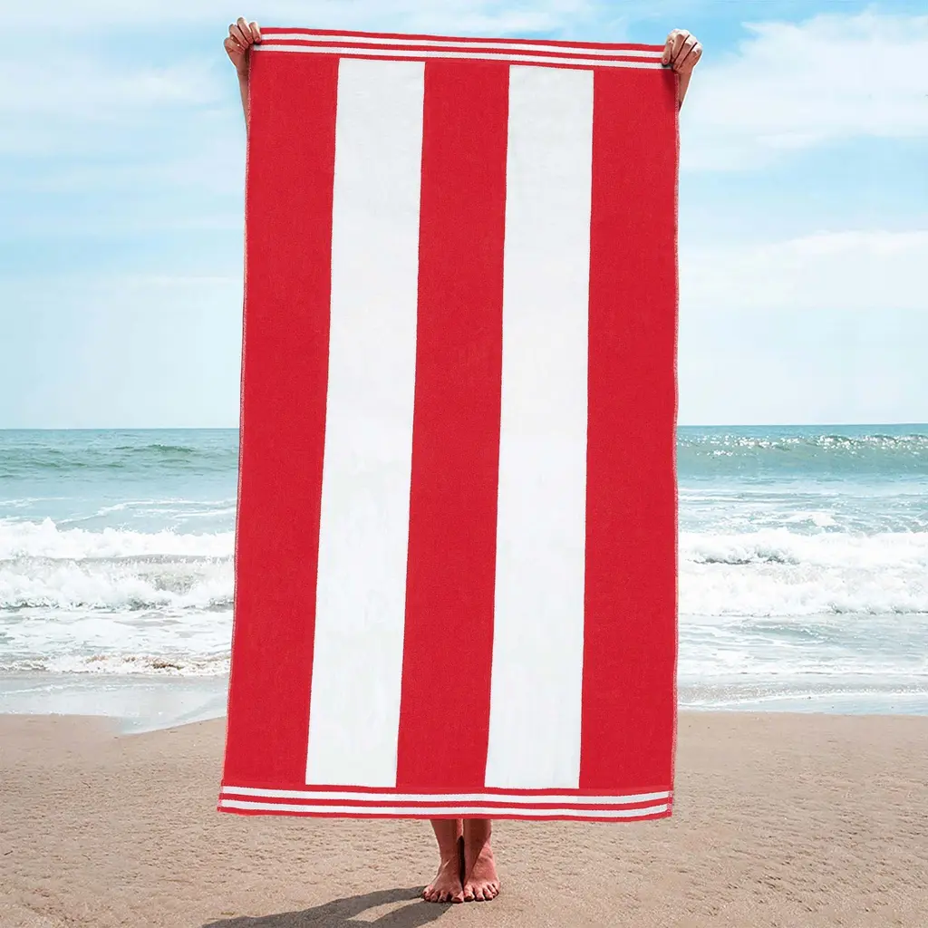 The Cabana Stripe Oversized Cotton Beach Towel by Superior makes a great addition to your poolside festivities. This cozy, oversized beach towel features a premium Cotton material with a festive cabana stripe pattern that is available in a variety of stylish colors. This design reverses from a soft velour side to an absorbent terry loop side that will keep you warm and dry you off quickly. Ideal for travel, you can carry this towel to the beach, keep it poolside, or decorate your bathroom in style. Relax in comfort with this must-have summer accessory. Features: