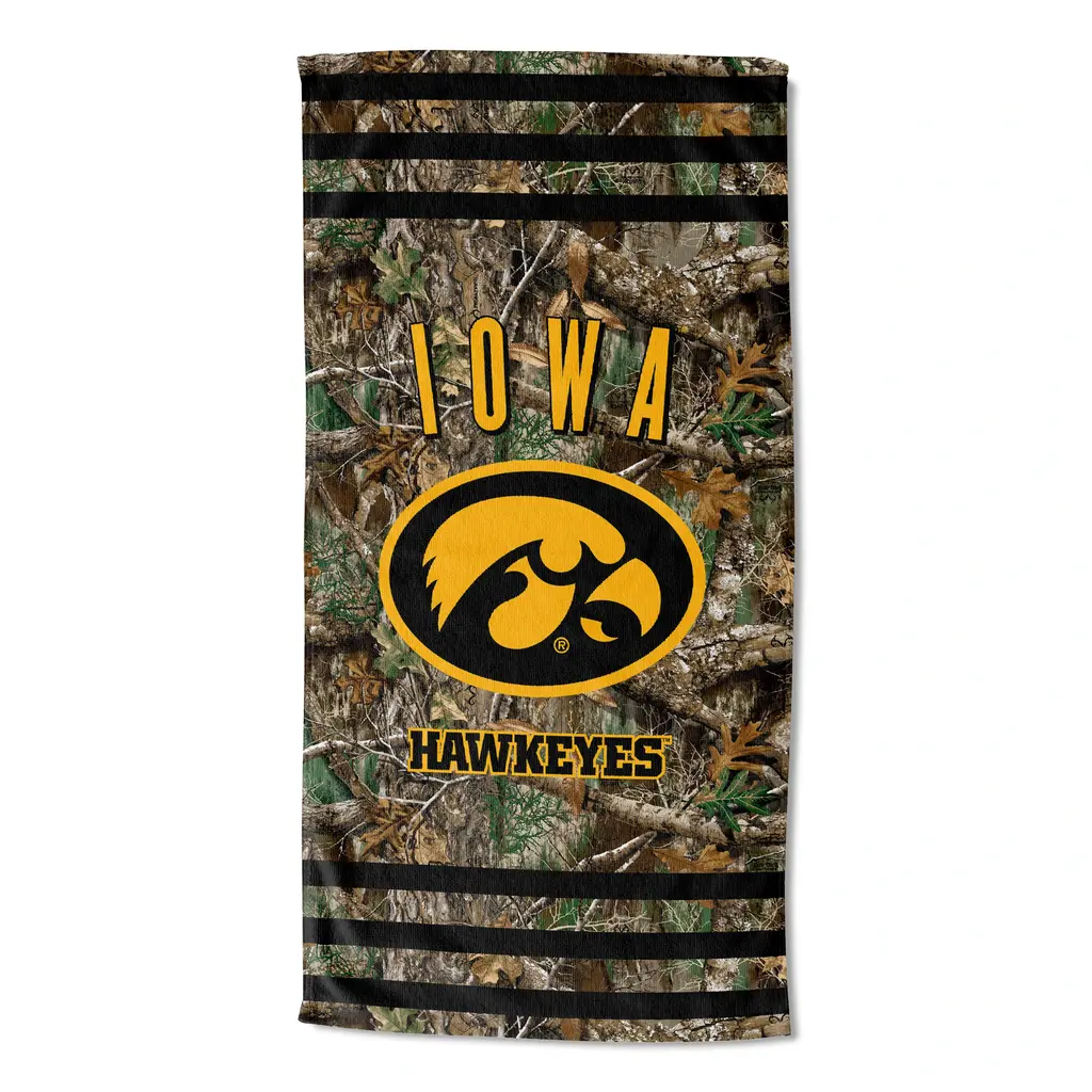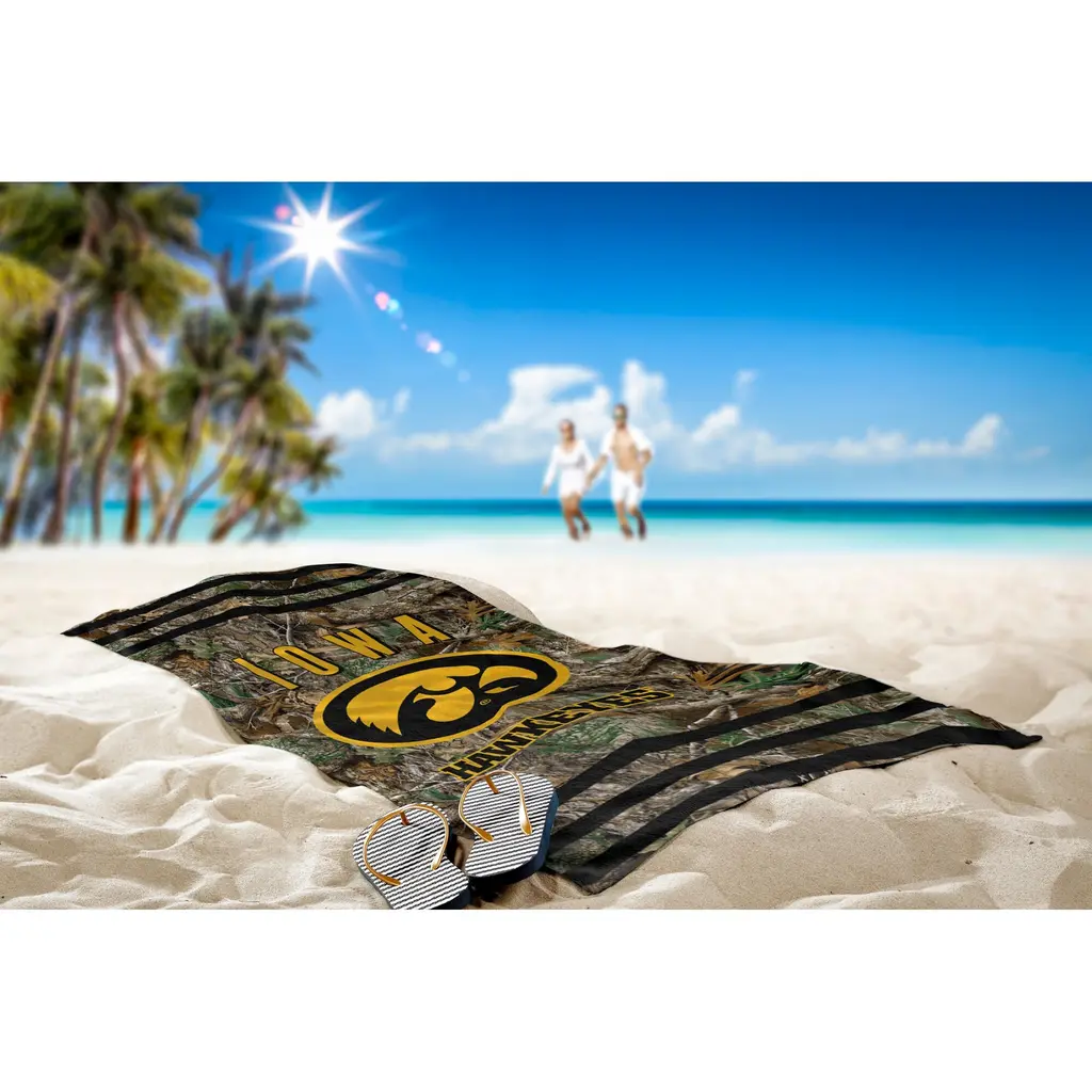 Never blend in while lounging on this Officially Licensed NCAA Realtree Beach Towel by TheNorthwest. Ideal for the outdoor adventurer, these unique camo towels are perfect for any pool or beach day. Featuring a college team name and logo on a Realtree camo background, this absorbent 30"x 60" towel is the perfect accessory for drying off after a swim. This cotton-poly blend towel will stand out!