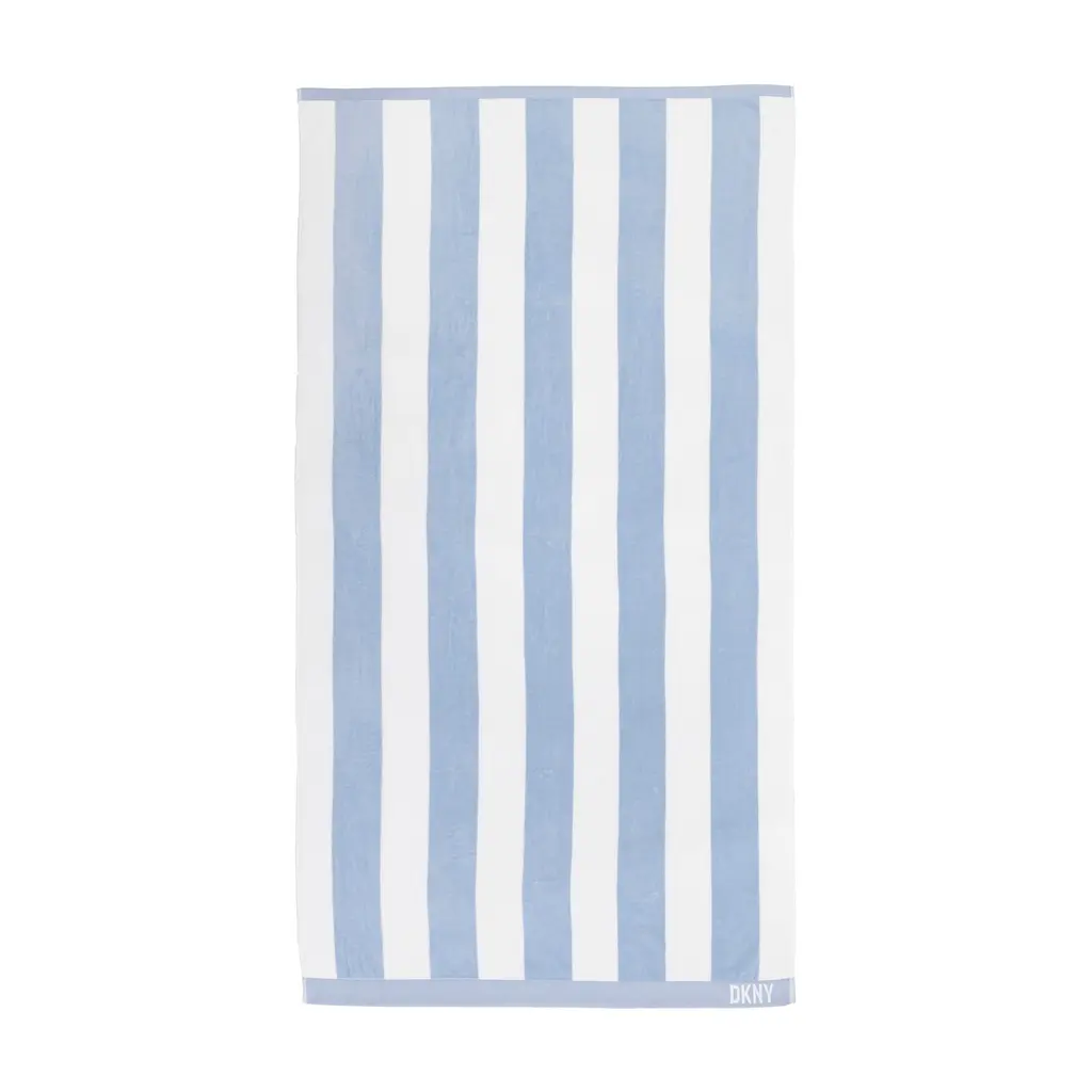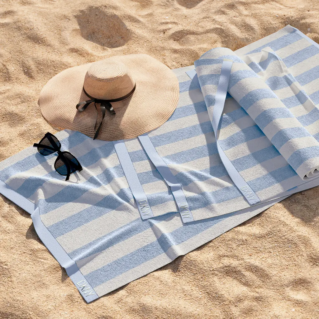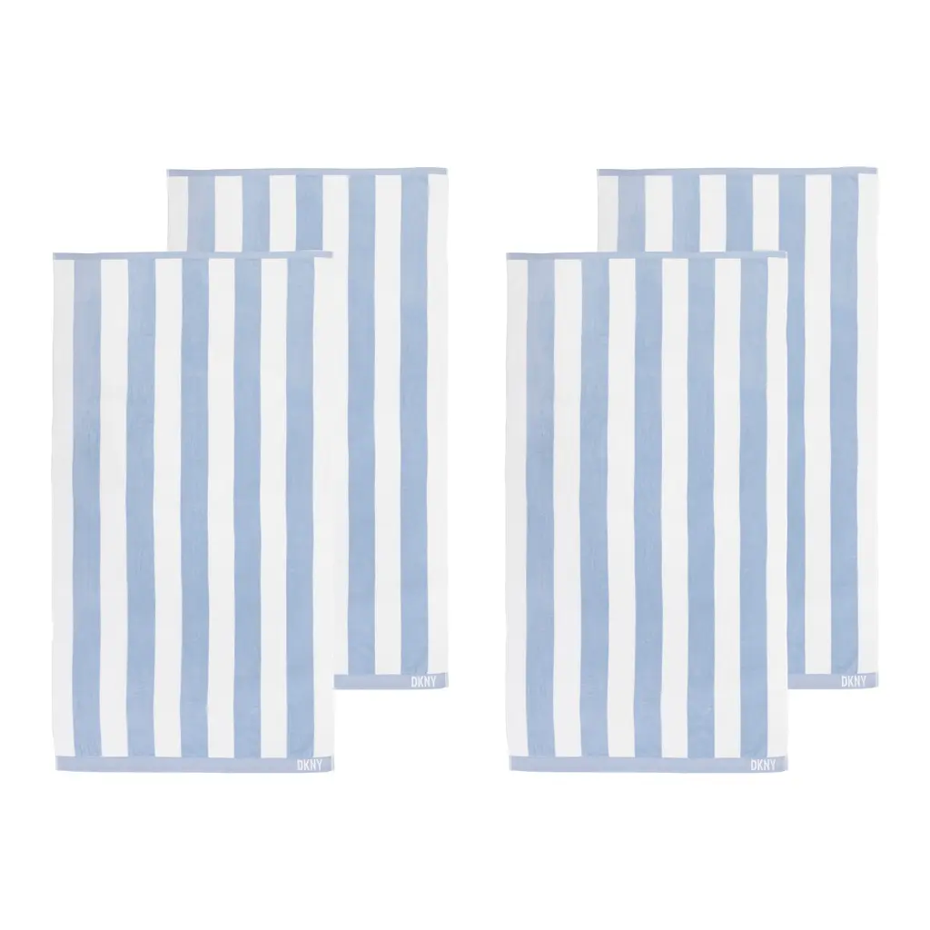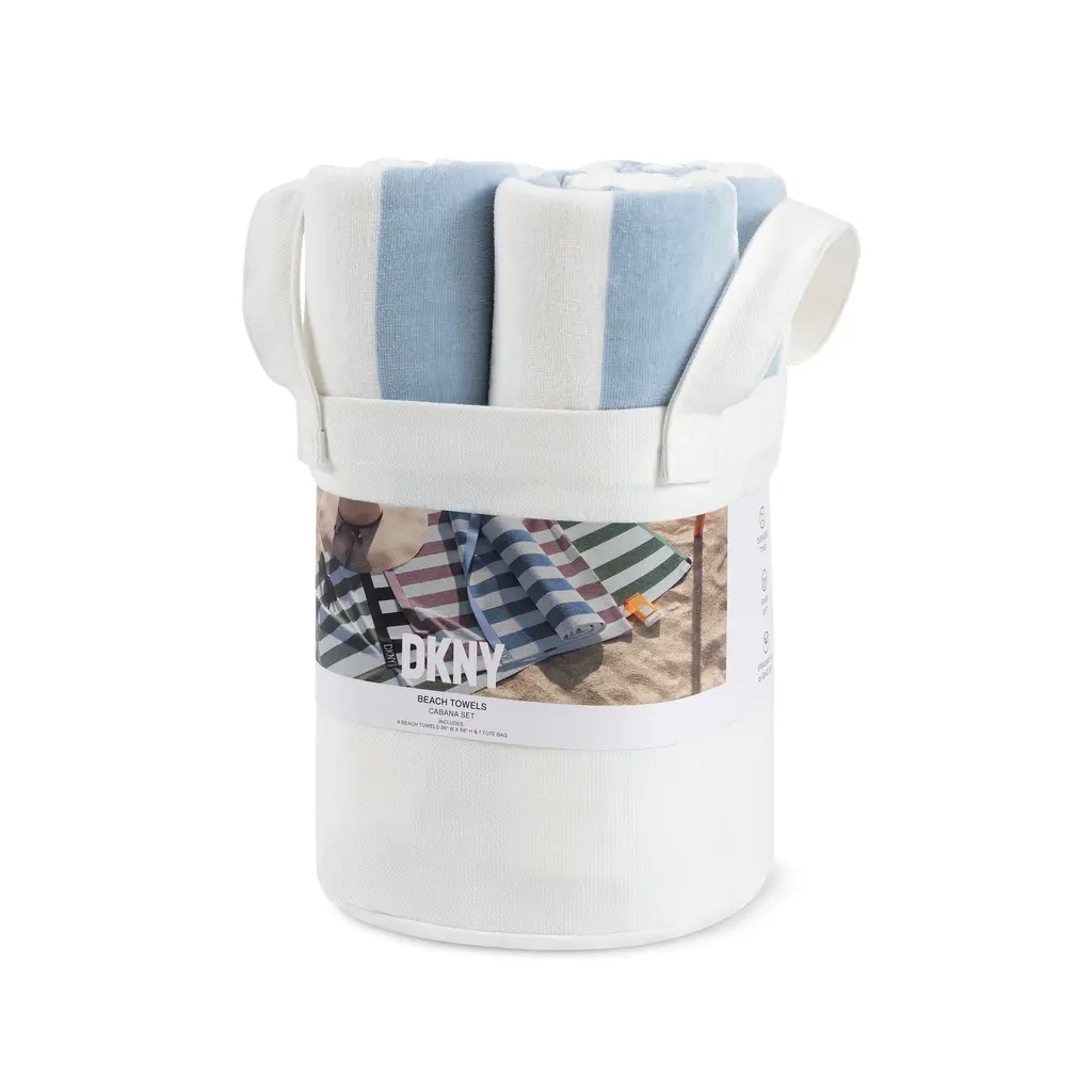 Your next beach day just got a stylish update with the DKNY Cabana Stripe 4-Piece Beach Towel Set. Classic cabana stripes are yarn-dyed for long-lasting color, perfect for repeat swim days all season long. The sheared cotton ensures a plush touch that is highly absorbent. The set of four is great for sharing with beach buddies or having a towel on hand for your daily sunny escapades. Conveniently packed in a reusable canvas tote bag for easy carrying.