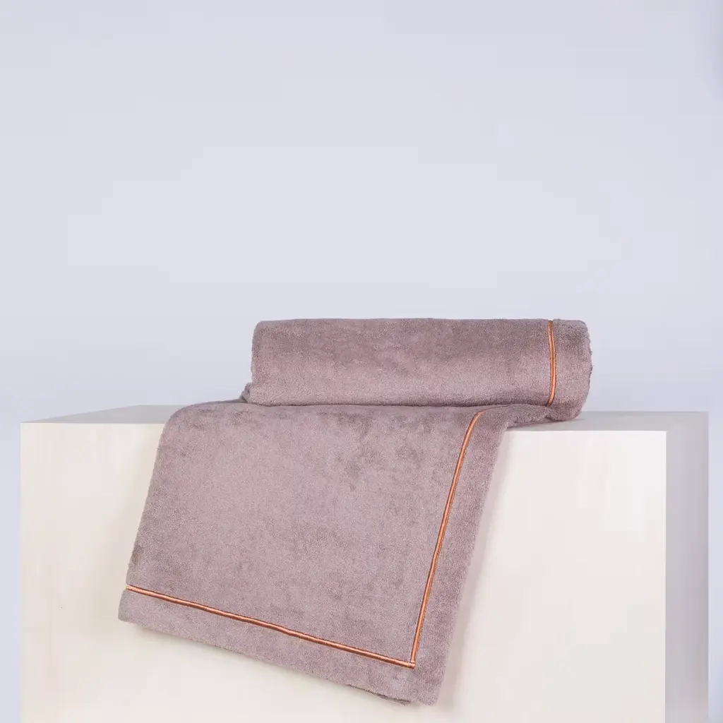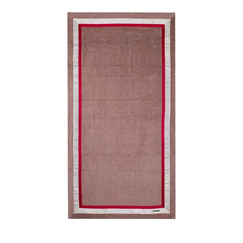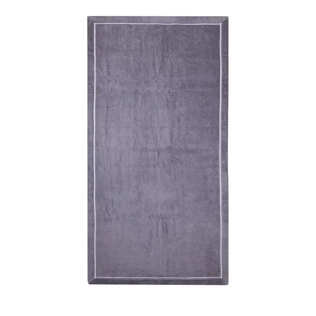 This elegant beach towel in dove-grey is crafted in Egyptian cotton of the finest quality, accented by a bronze ribbon embroidered in Lurex yarn that runs around its perimeter. The metal logo plate has been embossed and sports an 18K gold finish.