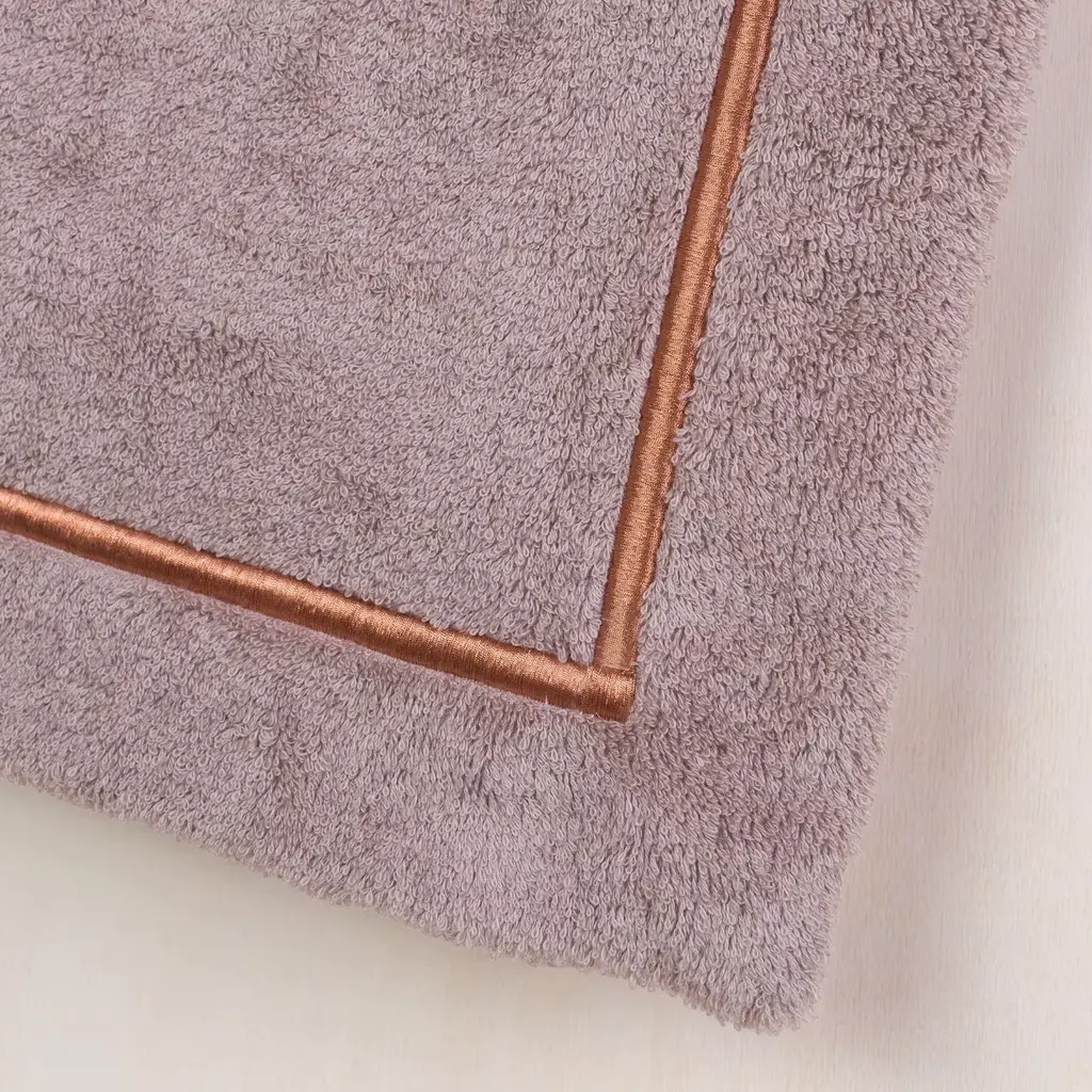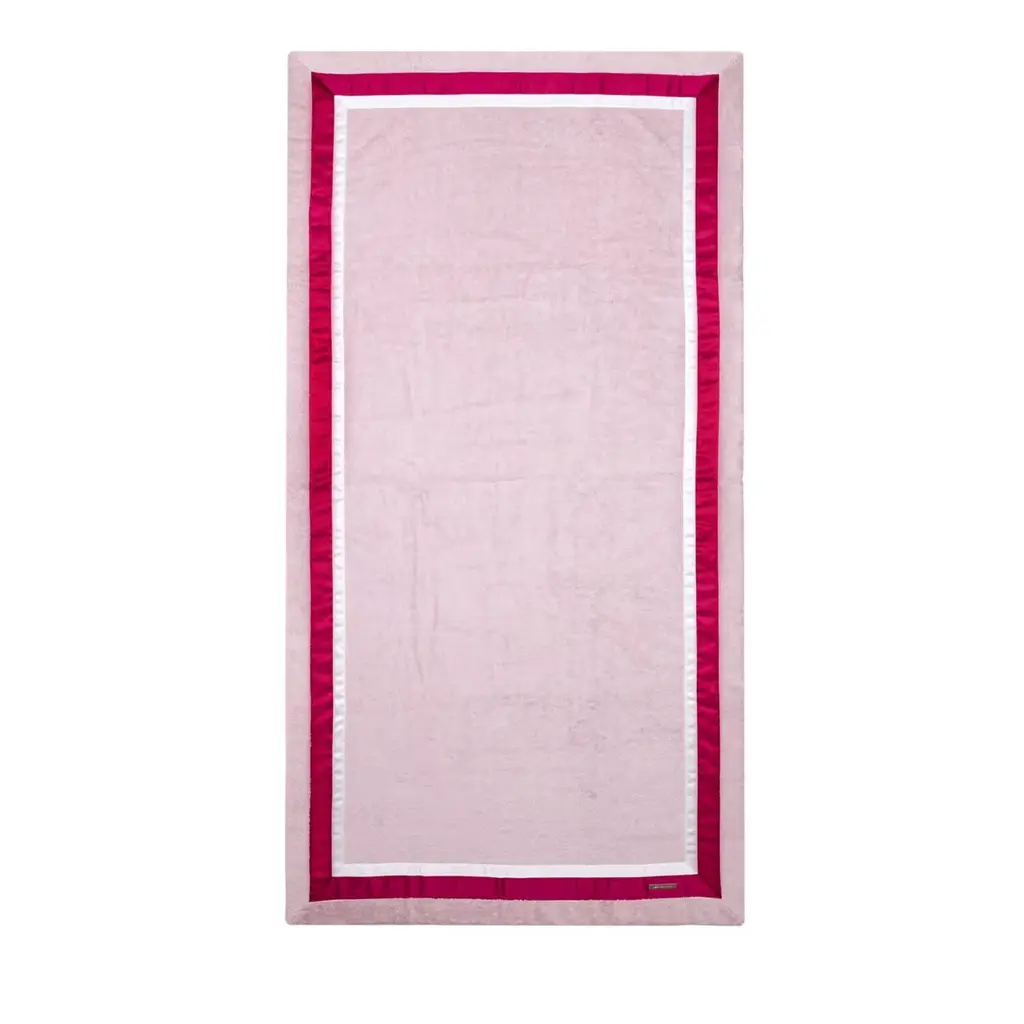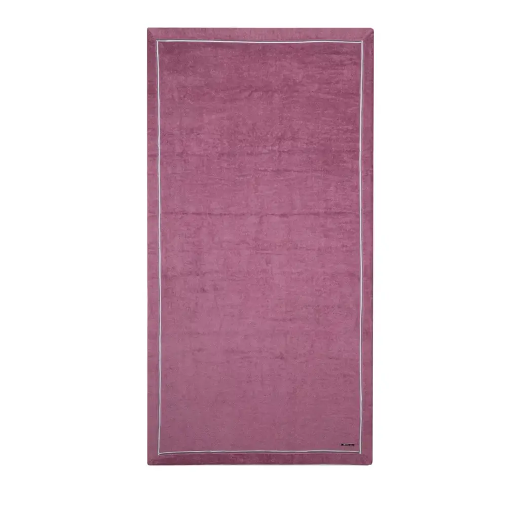 This elegant beach towel in dove-grey is crafted in Egyptian cotton of the finest quality, accented by a bronze ribbon embroidered in Lurex yarn that runs around its perimeter. The metal logo plate has been embossed and sports an 18K gold finish.