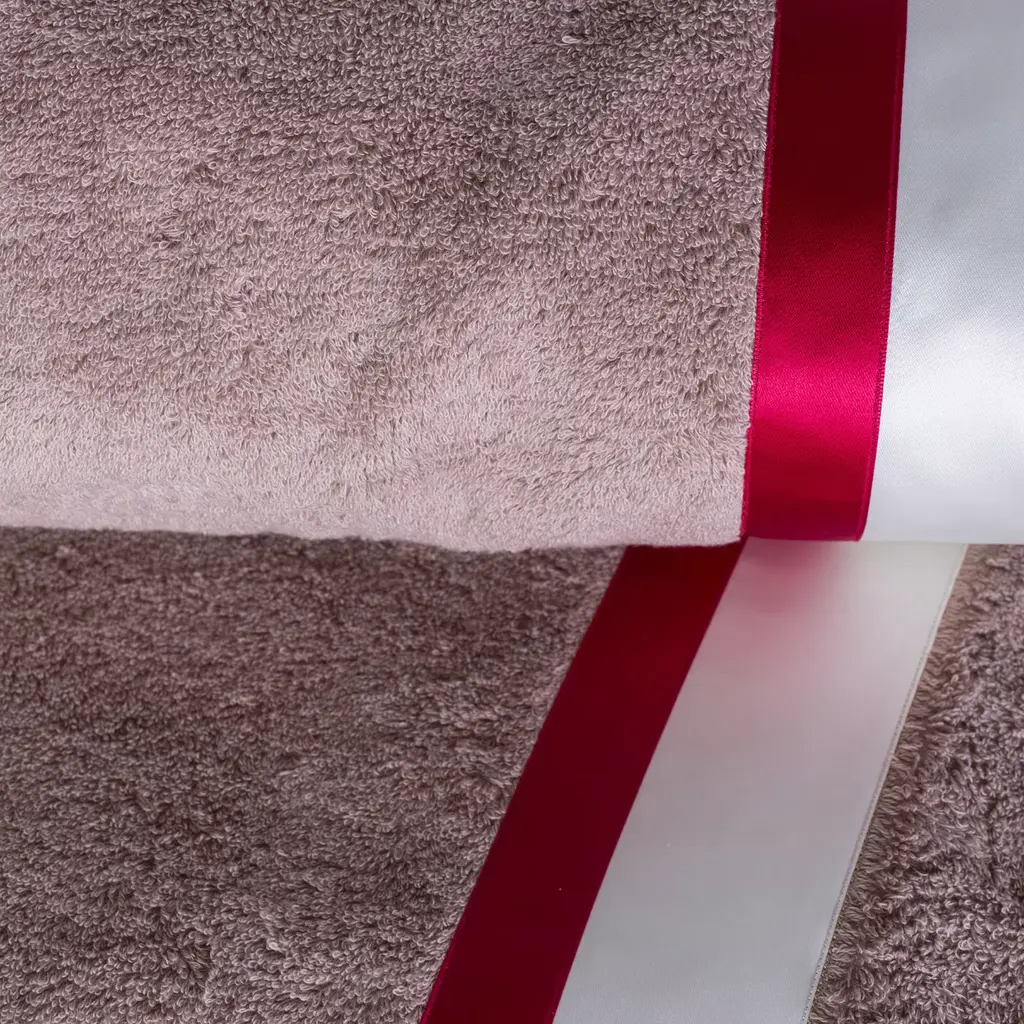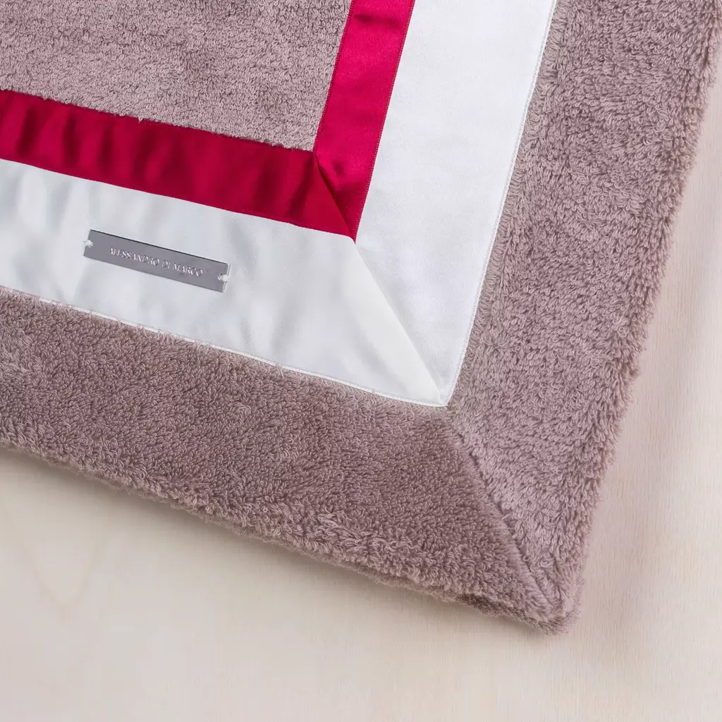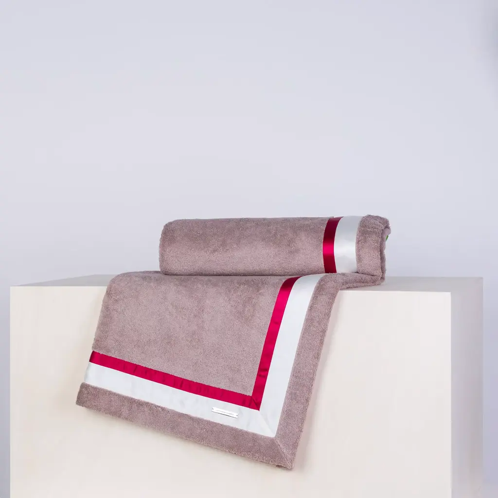 This elegant beach towel in lead-grey is crafted in Egyptian cotton of the finest quality, accented by two satin ribbons that run around its perimeter in red and white. The metal logo plate has been embossed and sports an 18K gold finish.