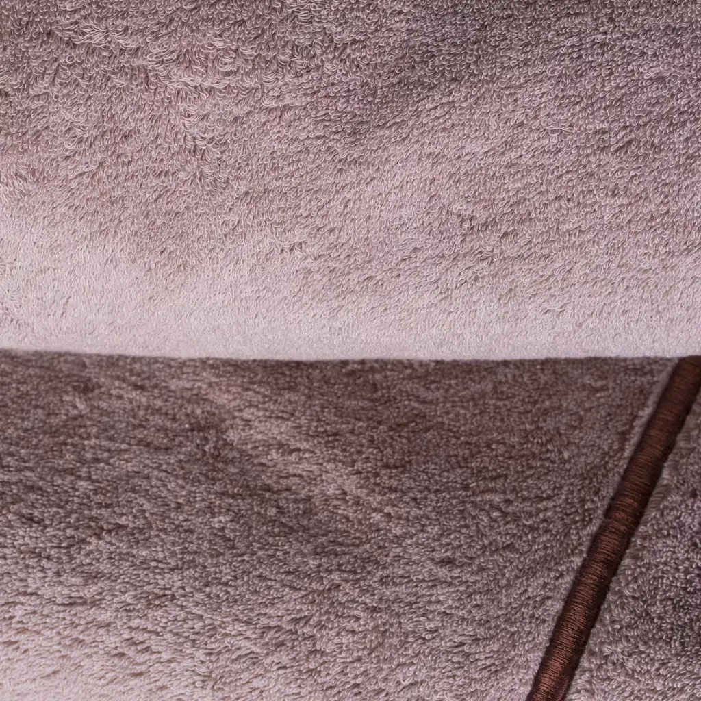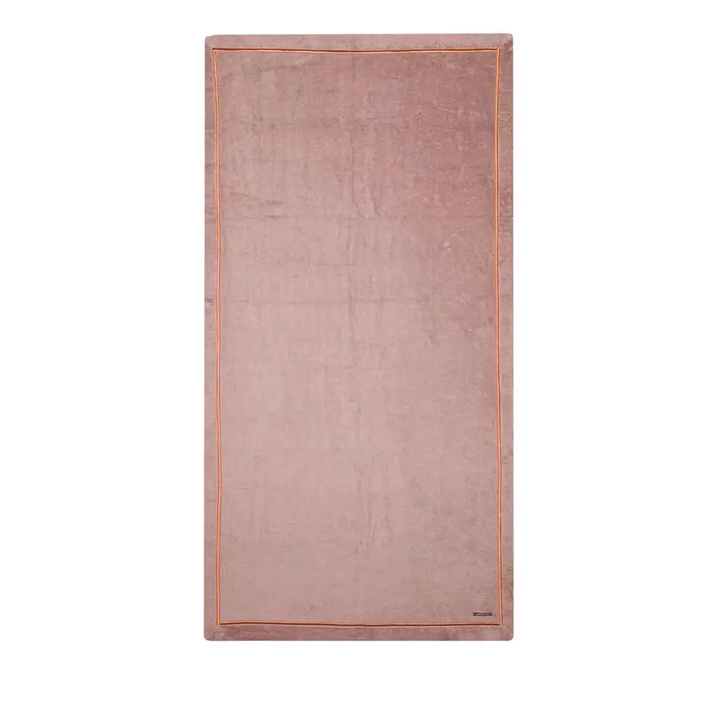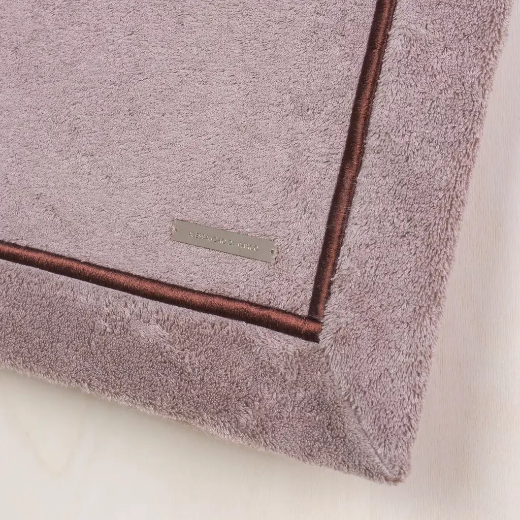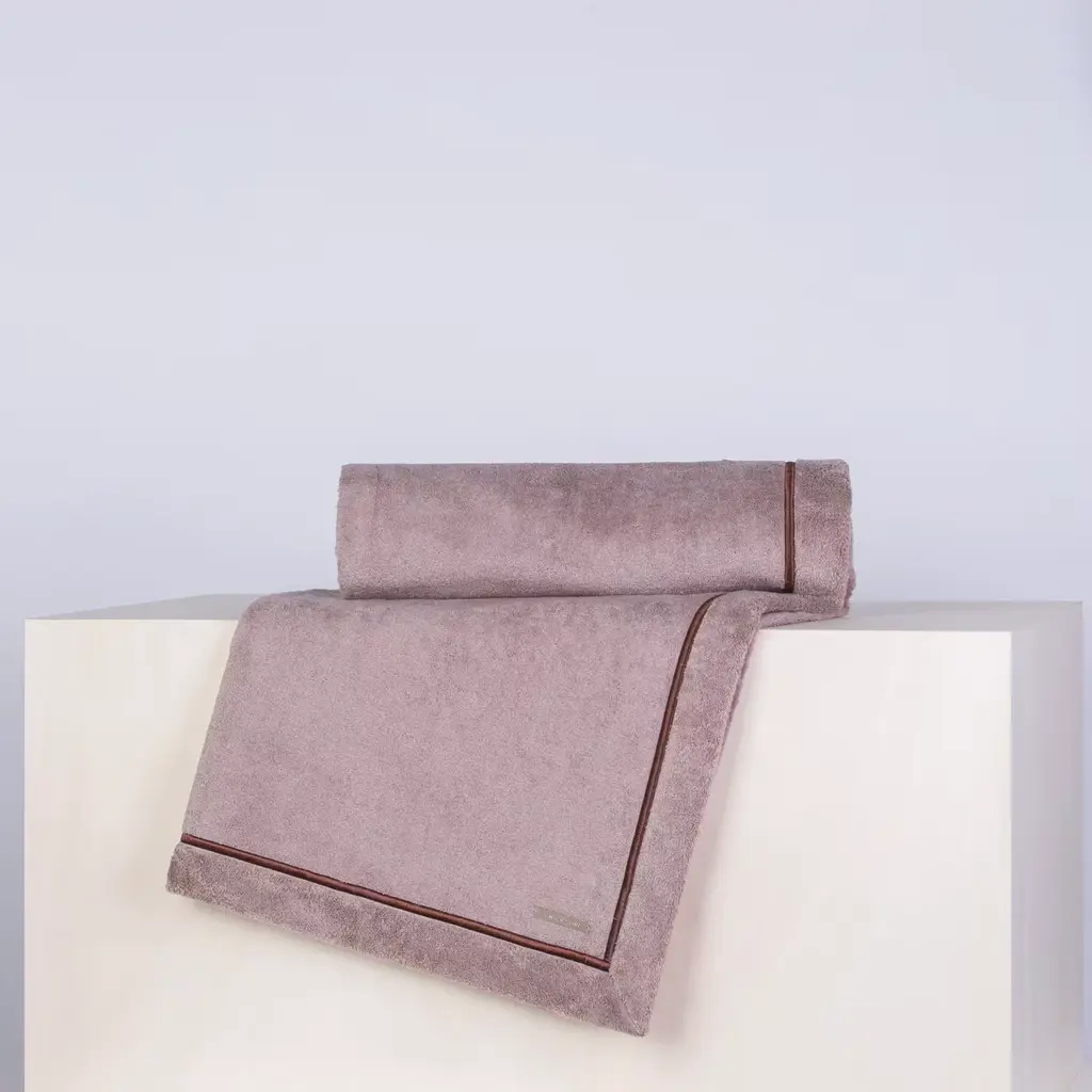 This elegant beach towel in dove-grey is crafted in Egyptian cotton of the finest quality, accented by a brown ribbon embroidered in Lurex yarn that runs around its perimeter. The metal logo plate has been embossed and sports an 18K gold finish.