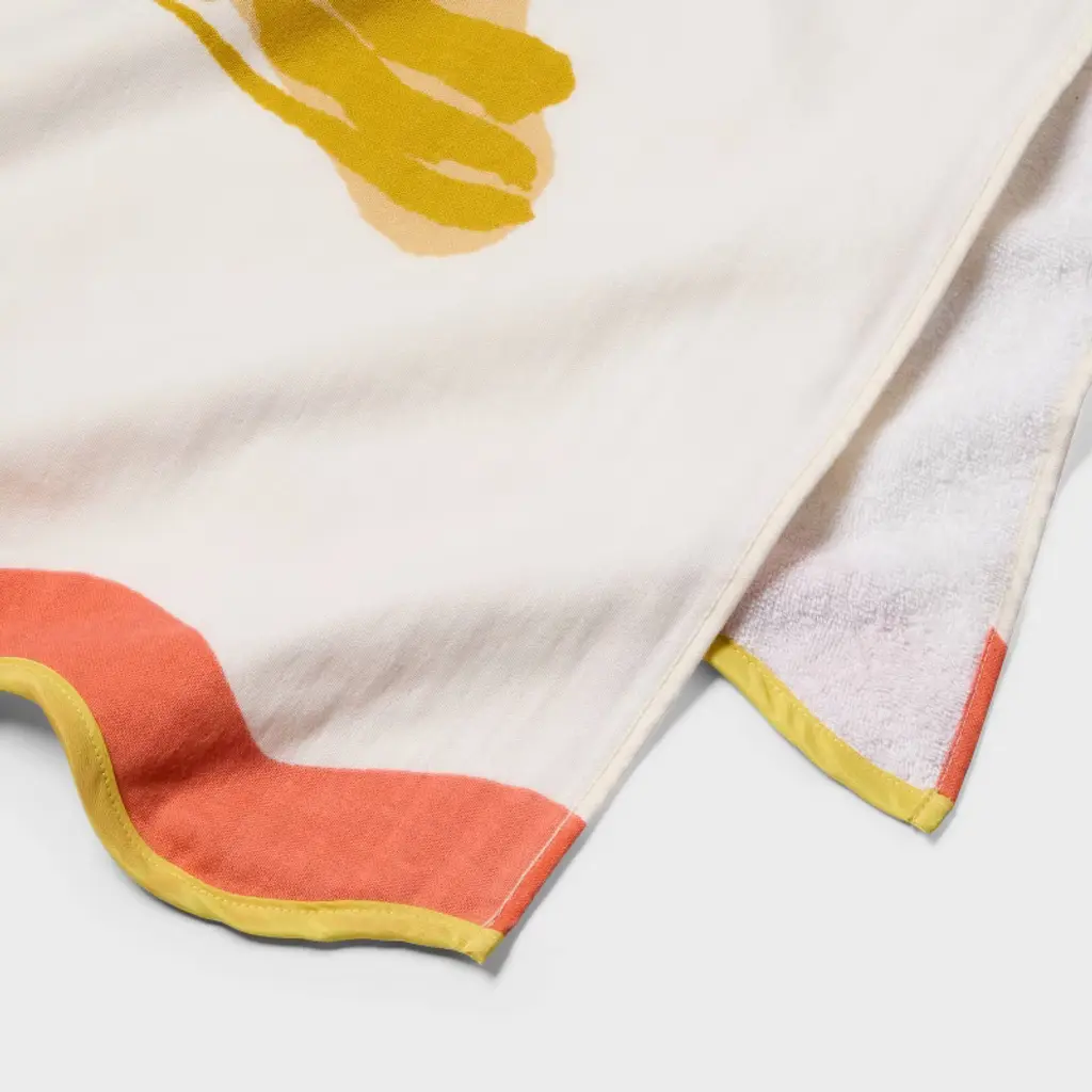 Fill your bath space with artistic style with this Fish Oversized Towel from Threshold™. Made from 100% cotton, this oversized bath towel feels soft against your skin and helps you dry off quickly. It's adorned with paintbrush-style fish prints in green and brown hues on a cream background and a scalloped hem in contrasting orange and yellow hues, sure to add a decorative flair to your bathroom decor.Threshold™: Looks like home, feels like you.