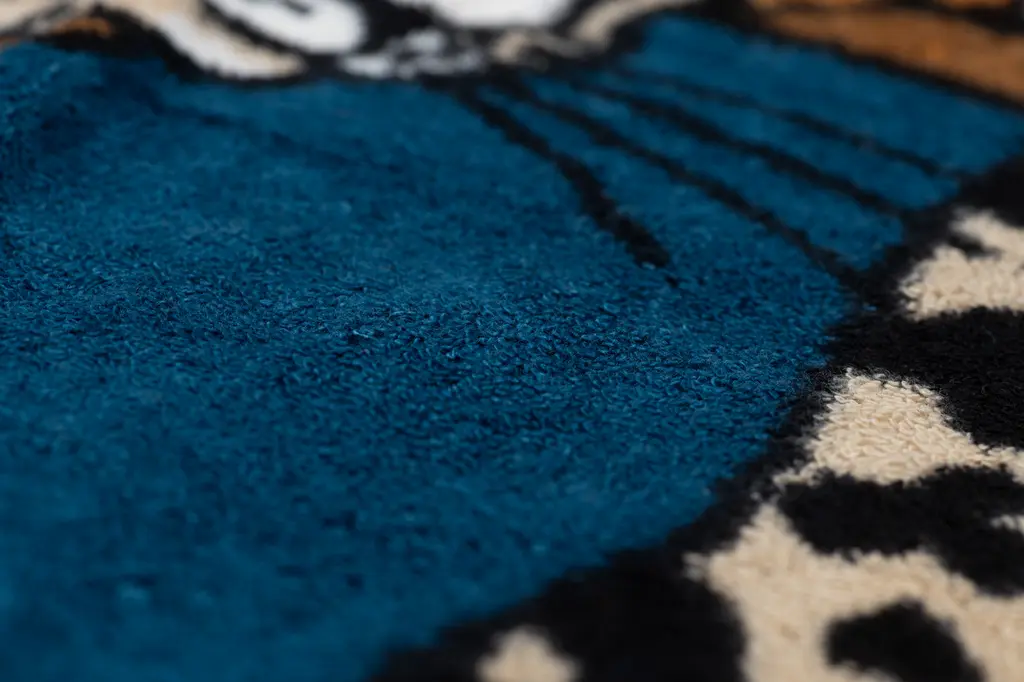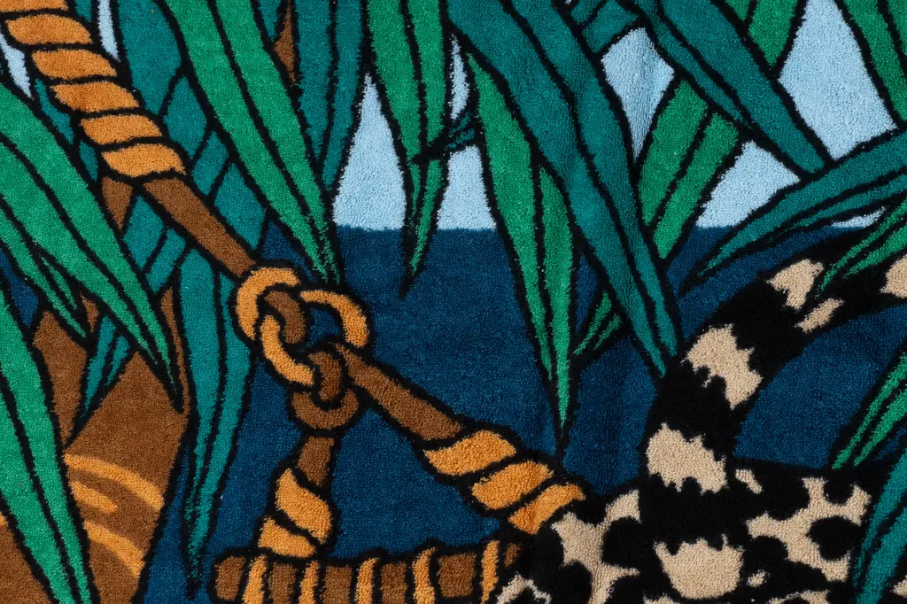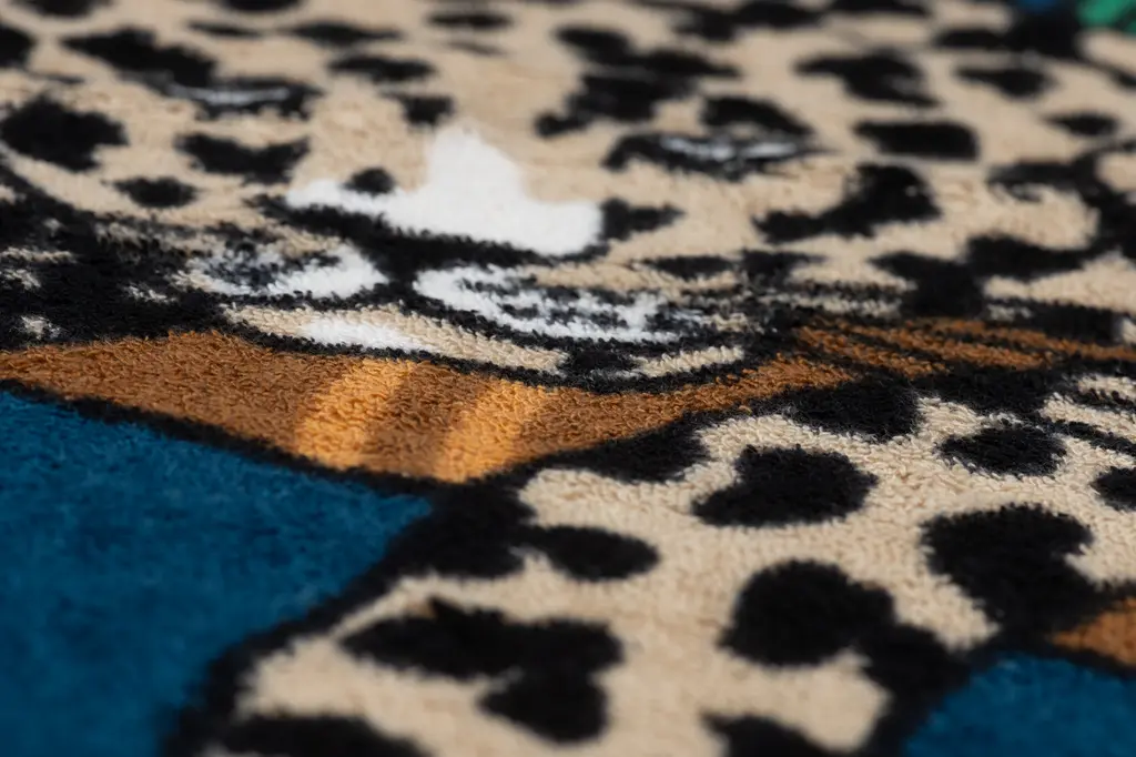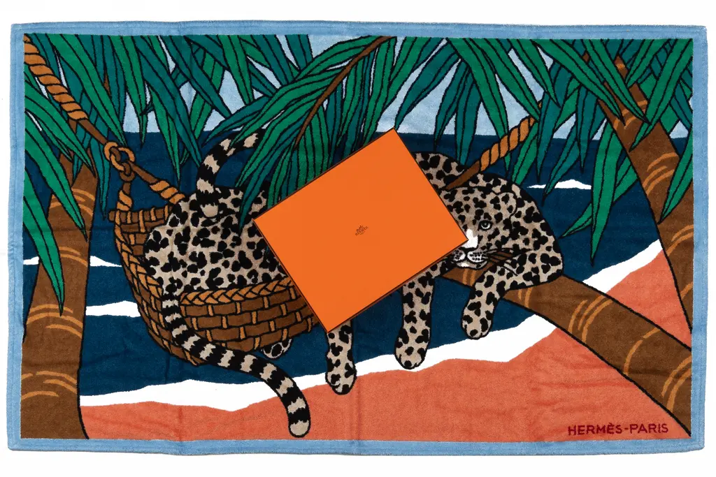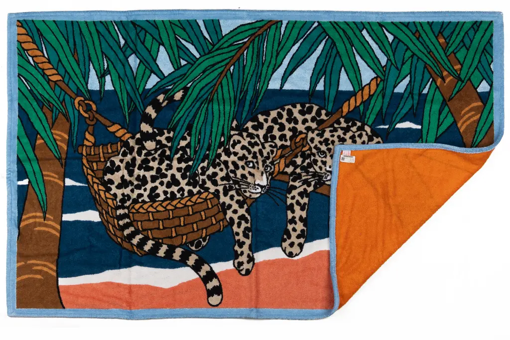 Hermès Leopard Beach Towel in green and blue. The pattern shows two blue leopards in a hammock. The item is in new and comes with the box.