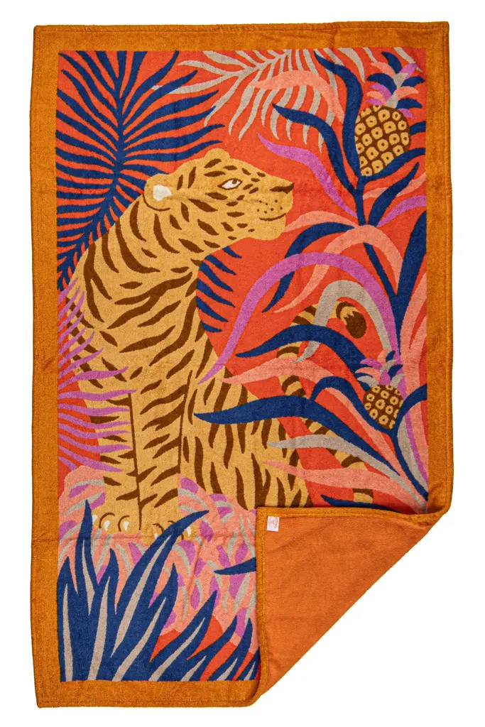 This Hermès Tigre a l'Ananas Terry Cloth Beach Towel in 100% cotton features a Tiger motif with a solid orange back, designed by Stéfany Devaux Bellamy. Brand new in unused condition.