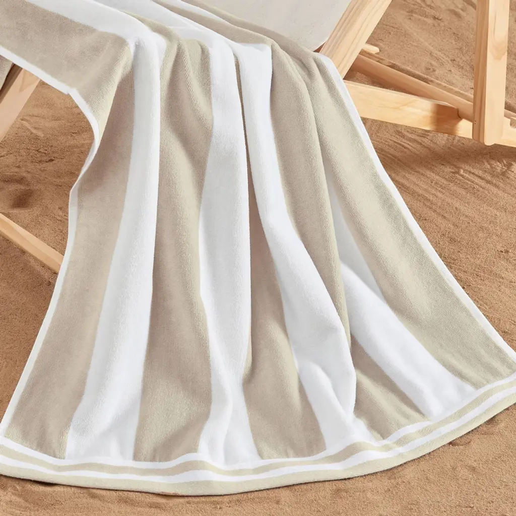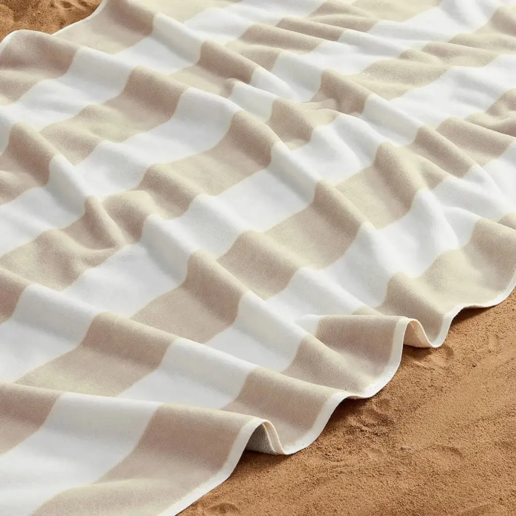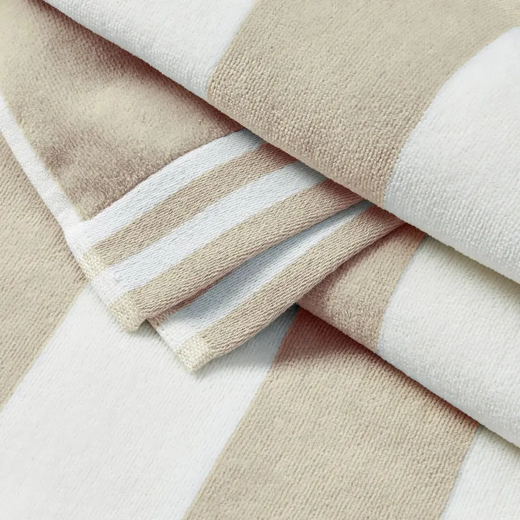 Create an oasis of comfort as you wrap yourself in these ultra-soft, absorbent cabana beach towels. Meticulously crafted, each towel bears the softness, absorbency, durability, and modern take on a classic sense of style that fits any summer aesthetic. This set includes cabana striped towels, offering a timeless look that complements any beach ensemble. With a palette of soft, pastel colors to choose from, these cotton towels effortlessly blend into your beach aesthetic, providing a fun and elevated touch that everyone can appreciate. Redefine your beach experience, where modern style meets timeless comfort. These beach towels are Made in Green Certified by OEKO-TEX® and have been independently tested and certified free from harmful chemicals and manufactured in environmentally friendly facilities under safe and socially responsible working conditions.