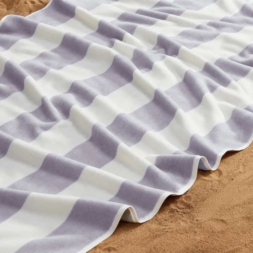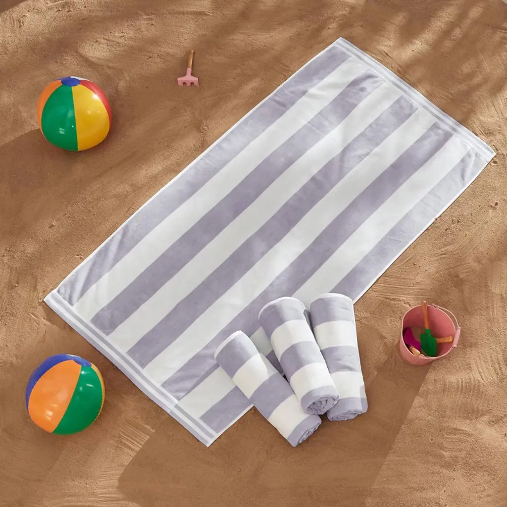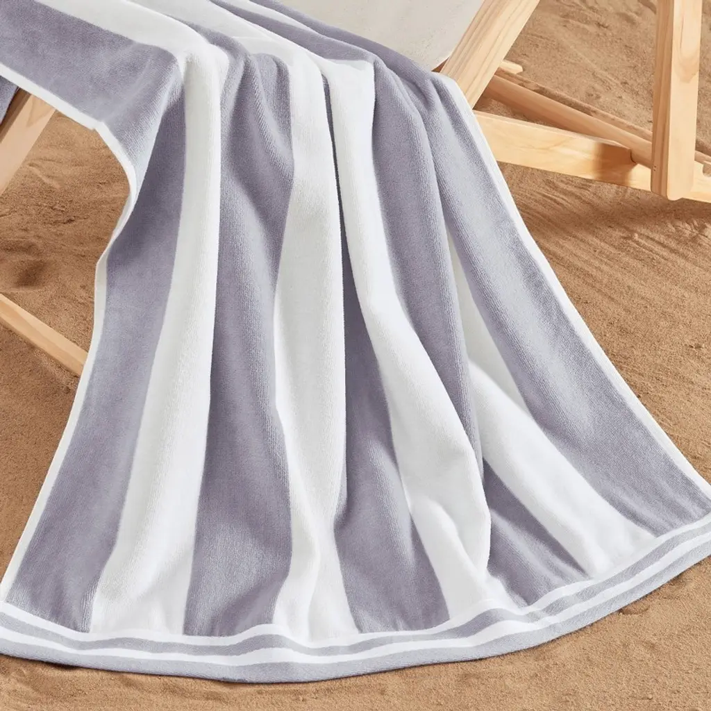 Create an oasis of comfort as you wrap yourself in these ultra-soft, absorbent cabana beach towels. Meticulously crafted, each towel bears the softness, absorbency, durability, and modern take on a classic sense of style that fits any summer aesthetic. This set includes cabana striped towels, offering a timeless look that complements any beach ensemble. With a palette of soft, pastel colors to choose from, these cotton towels effortlessly blend into your beach aesthetic, providing a fun and elevated touch that everyone can appreciate. Redefine your beach experience, where modern style meets timeless comfort. These beach towels are Made in Green Certified by OEKO-TEX® and have been independently tested and certified free from harmful chemicals and manufactured in environmentally friendly facilities under safe and socially responsible working conditions.