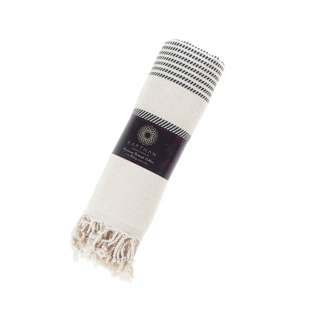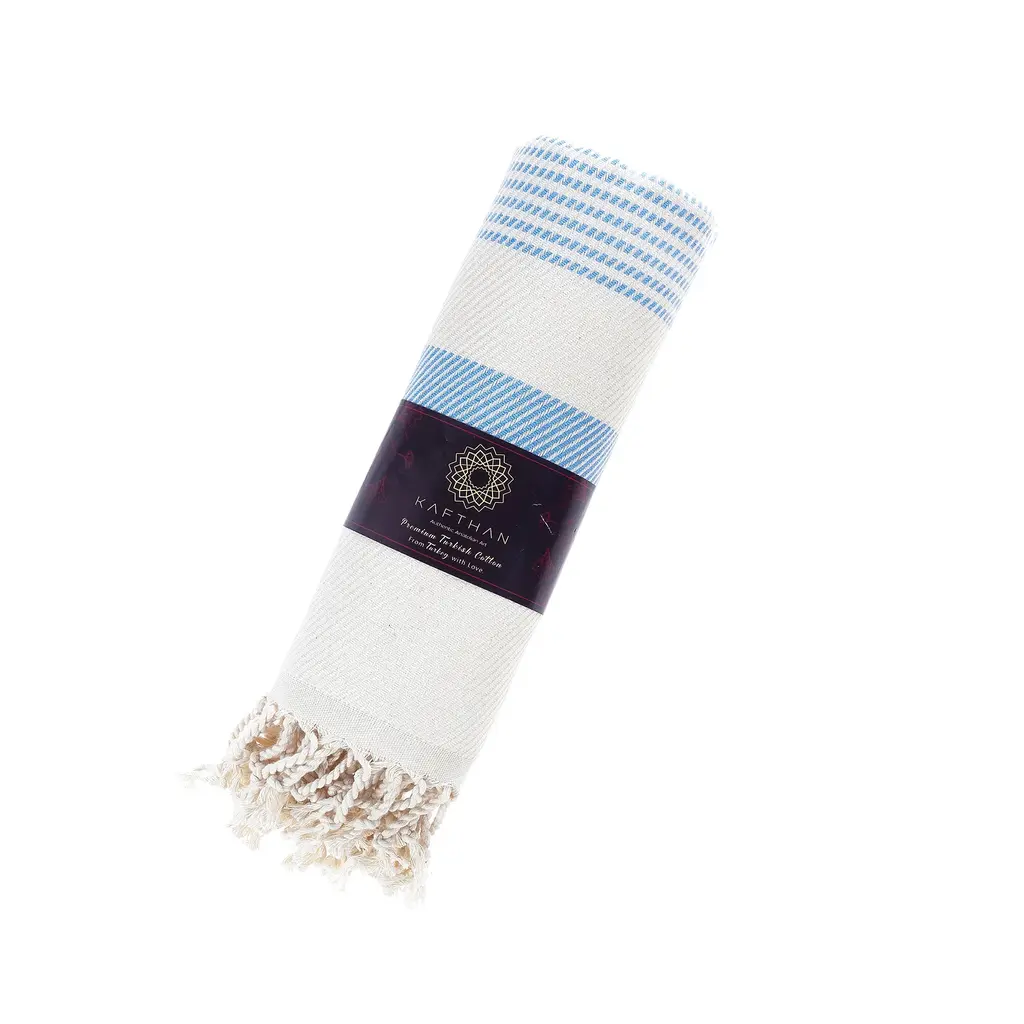 Kafthan's premium Turkish cotton beach and bath towels are lightweight and easy to carry with on a vacation. Our Turkish towels can be used as a light travel blanket or as a throw with their elegant style. Kafthan's Turkish towels soak up water with ease and dry quickly. Turkish towels are sand resistant which makes them perfect for a beach trip. Turkish towels can also be used as a picnic blanket or stroller cover. Turkish towels are a perfect accessory at home and on vacation.Features: