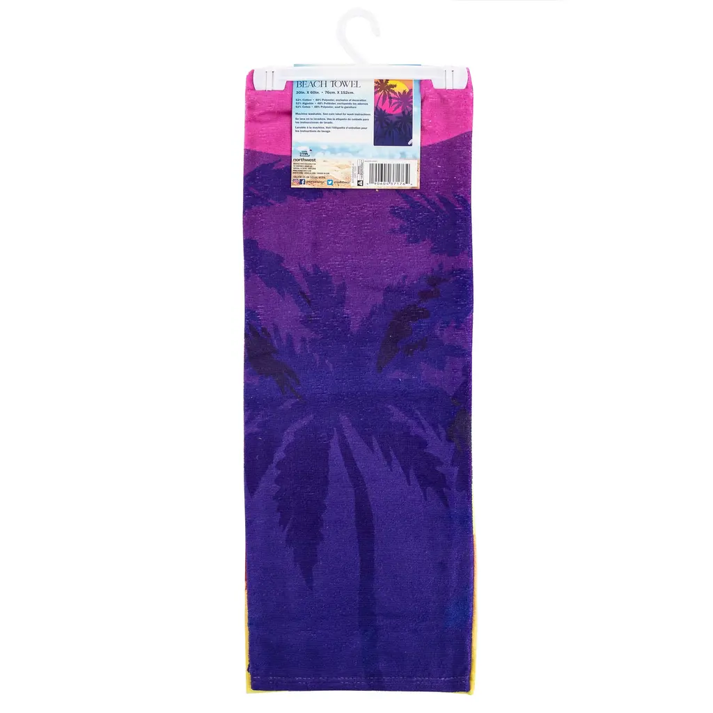 Grab a Magenta Sun Set Beach Towel to have a cheerful and carefree summer day! Lounge by the pool or at the beach showing off this fun towel. This vivid 30"x 60" towel features palm trees and the sun in shades of pink and purple, laid out vertically. Use this soft cotton-poly blend towel to dry off after a nice dip in the water!