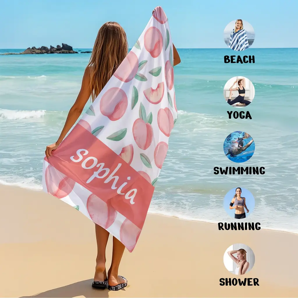 Stand Out This Summer with a Personalized Peach Towel! 🍑 Choose your size — 30"x60" or 35"x70" — and add your name for a fun, one-of-a-kind beach essential. ✨ To order: Send the order details to " customercare@jmltrade.org ". Example: Order number: 123456789 Buyer name(Order recipient):Amanda Lewis Custom text(Print on beach towel): Lila Features: Soft, Absorbent, and Durable: Crafted from high-quality, quick-drying microfiber, this towel is soft to the touch yet durable enough to stand up to frequent use. It's lightweight and easy to pack, making it an ideal companion for travel, sports, or simply relaxing outdoors. Two Size Options for Every Need: Choose from two practical sizes to suit your lifestyle — a standard 30"x60" towel that's perfect for everyday beach or pool outings, or a generously sized 35"x70" version for extra comfort and coverage. Whether you're lounging in the sun or drying off after a swim, we've got the perfect fit for you. Vibrant Peach Design with Personalized Name: Make a splash with our delightful peach-themed print, designed to evoke the sweetness and freshness of summer. Add your name or a loved one's to create a truly unique towel that's equal parts fun and functional — no more mix-ups at the beach! Summer-Ready Colors That Pop: Bright, cheerful hues inspired by sunny days and tropical fruits bring this towel to life. The warm tones are perfect for summer vacations, pool parties, or as a standout accessory for your beach gear. One-of-a-Kind Gift Idea: Looking for a thoughtful and practical gift? This custom beach towel is a hit for birthdays, holidays, graduations, or summer getaways. With its personalized touch and seasonal charm, it's a memorable present that anyone would love to receive