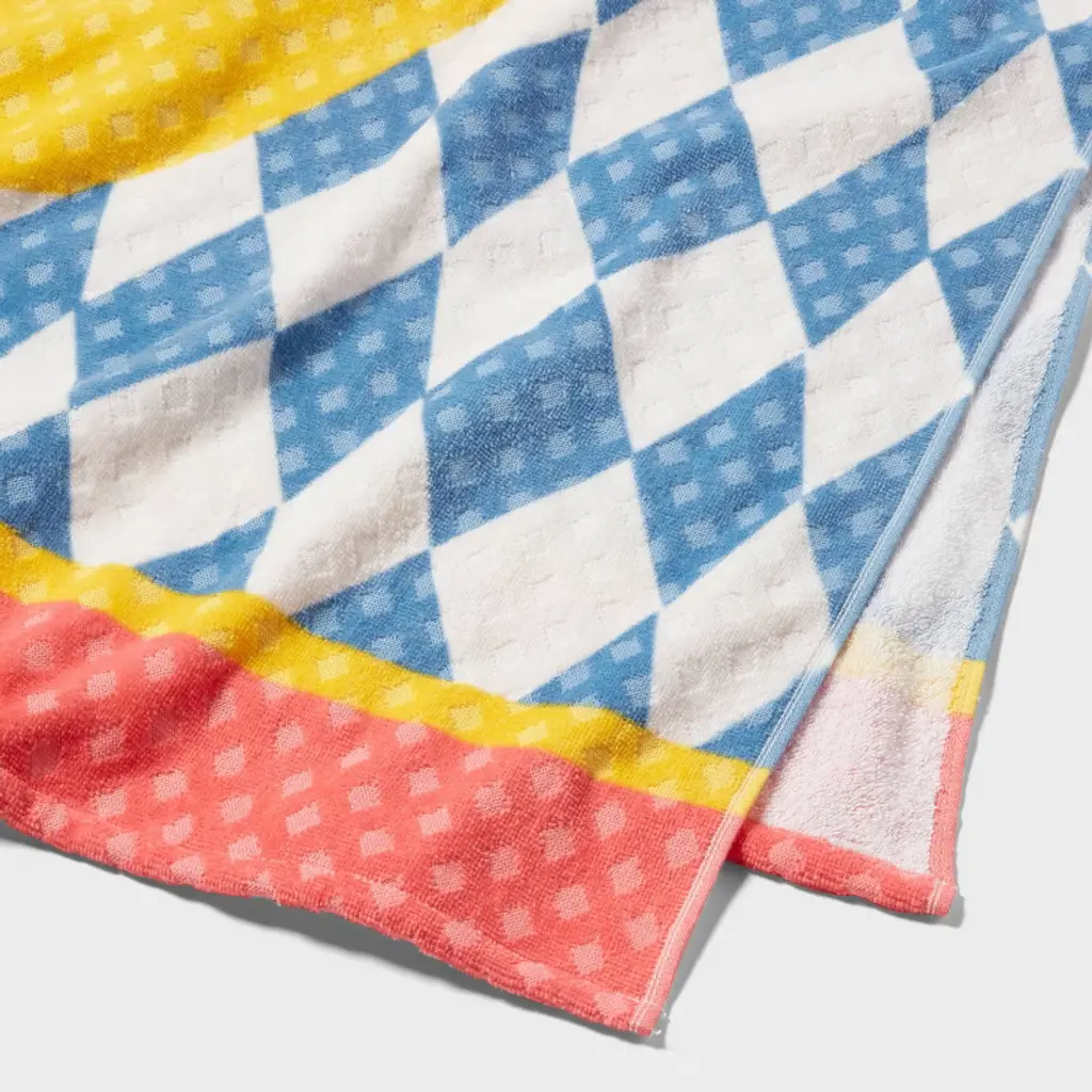 Add a fun pop of color to your waterside activities with this Popsicle Beach Towel from Room Essentials™. This beach towel showcases a yellow and pink popsicle print on a blue diamond-printed backdrop with a pink border for a bright and eye-catching look. Made of 100% terry cotton, this beach towel is perfect for sunbathing or drying off after a swim.Room Essentials™: Everyday Value