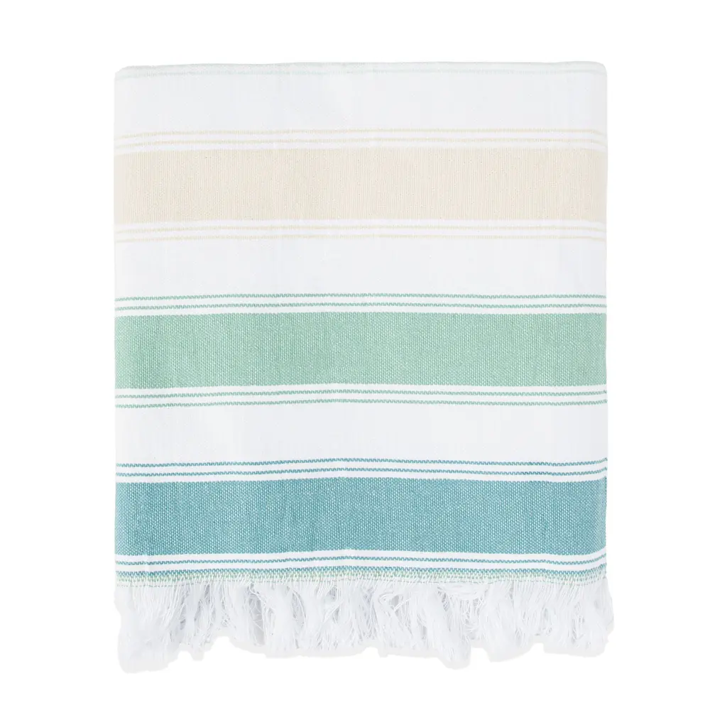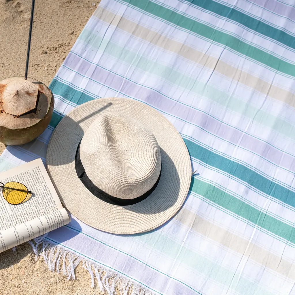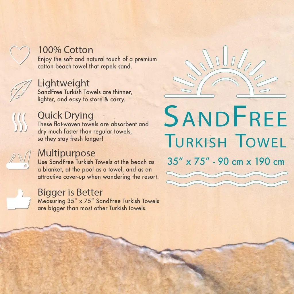 Our colorful striped Sand Free Turkish Beach Towel is as beautiful as they are versatile. Also known as Hammam towels, these 35X75 inch half towel-half blanket textiles have been traveling with adventurers for years. Turkish towels are a lightweight 100% cotton textile that is highly absorbent with a tight enough weave to repel sand from entering the fabric. Just a shake releases any sand quickly so you can wrap it around yourself or roll it up to tuck neatly into your bag. Turkish towels are quick drying and lightweight enough to fold up small making it easy to store and pack for travel. Enjoy the soft and natural touch of this premium cotton beach towel.