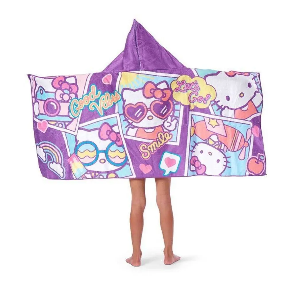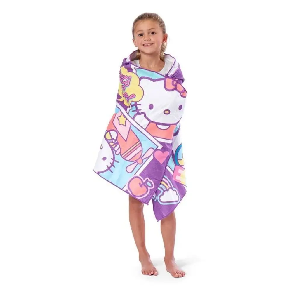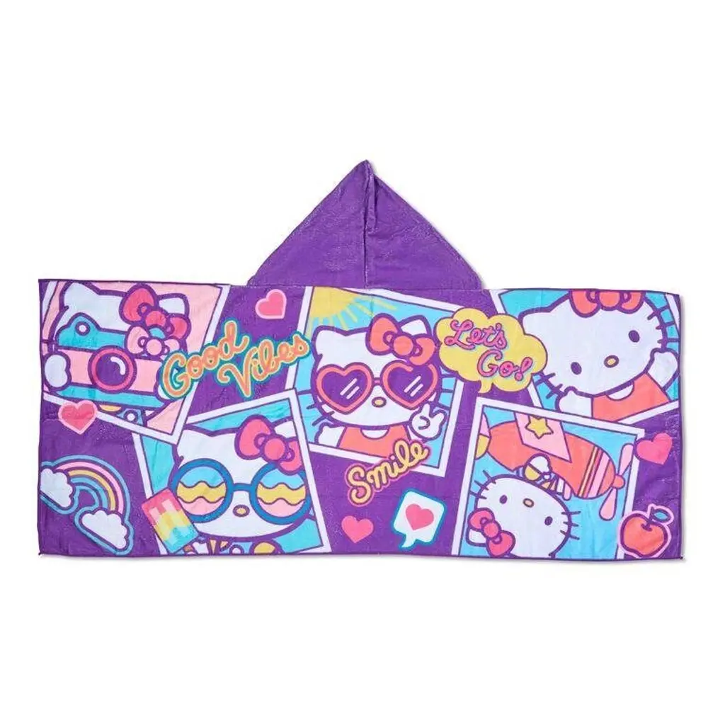 There's nothing better for bath time or trips to the beach than Sanrio's Hello Kitty "Let's Go" Hooded Youth Beach Towel by TheNorthwest! Wrap up and go from wet to dry with this fun towel. This soft and lightweight 22" x 51" towel has a hood in the center and hand pockets on top inside corners. Designed with multiple images of Hello Kitty on a fun purple background, this towel is the perfect accessory for any pool or beach day.
