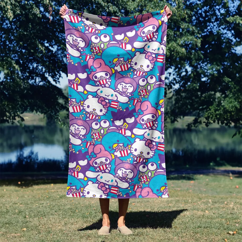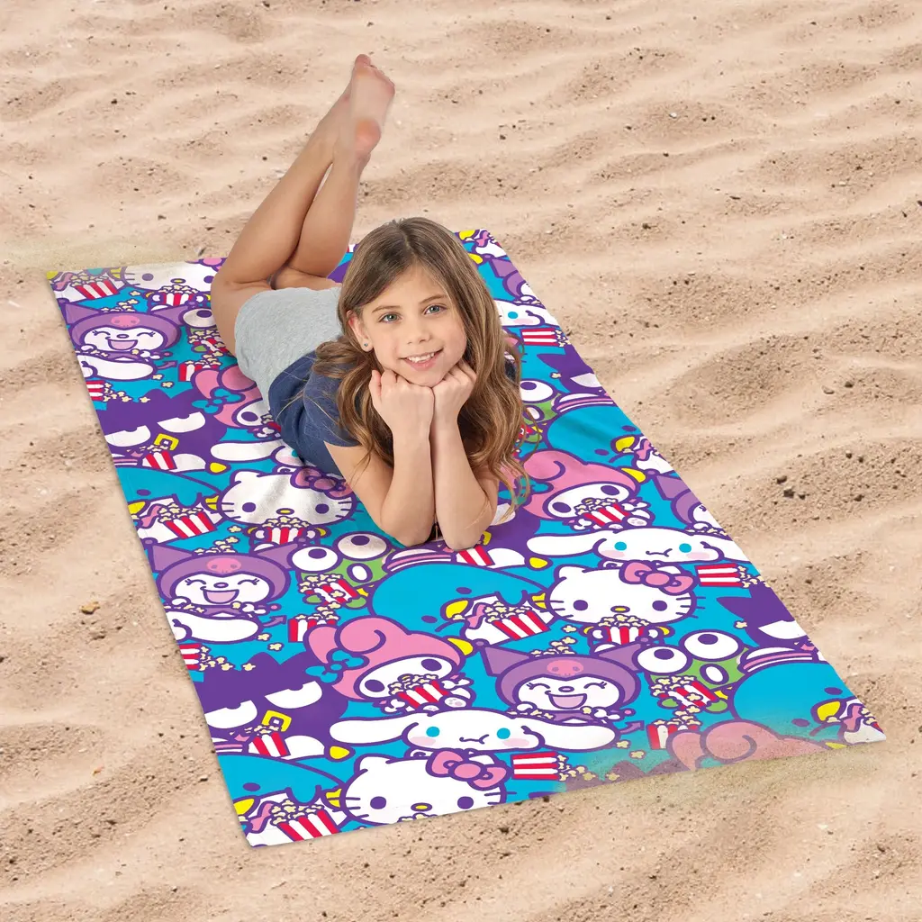 Brighten up your beach days with the Sanrio Hello Kitty Microfiber Beach Towel. This towel features a colorful pattern of Hello Kitty. Made from soft and absorbent microfiber, it's perfect for drying off after a swim or relaxing on the sand. The vibrant design and playful graphics make it a fun addition to any beach outing. Surprise a Hello Kitty fan with this cheerful towel! It's an ideal gift for birthdays, holidays, or just because. This delightful towel will bring smiles and fun to every beach trip.Features: