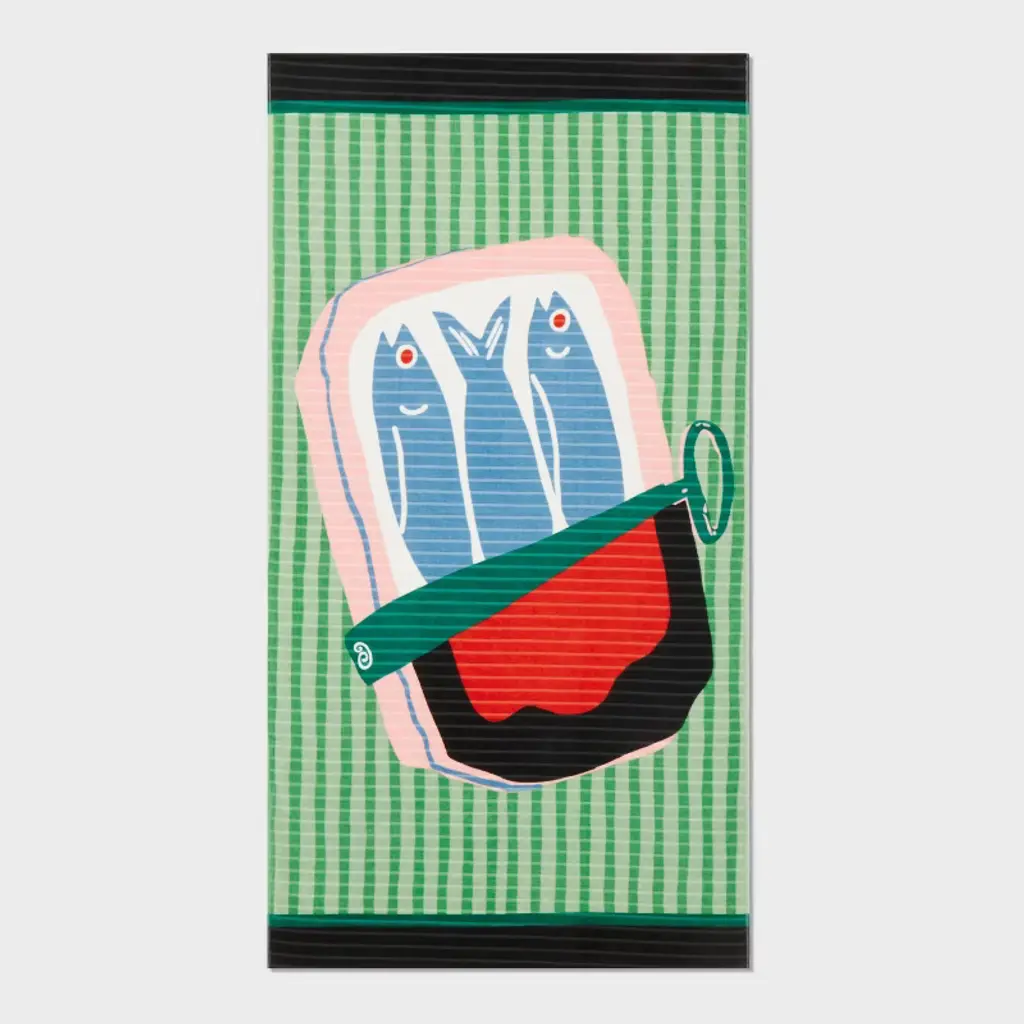 Enhance your beach towel collection with this Sardines Beach Towel from Room Essentials™. Made of 100% cotton terry fabric, this beach towel helps you dry off quickly, and it features a graphic of sardines with green stripes and black borders for an eye-catching look. It makes a perfect pick for beach vacations, pool parties and beyond.Room Essentials™: Everyday Value