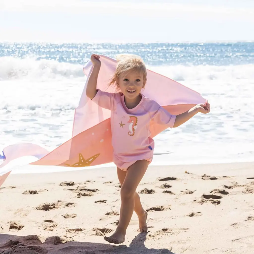 Embrace the "Sea la Vie" with the SARO Microfiber Beach Towel, designed for ultimate comfort and convenience during your beach and pool adventures. This extra-large towel, measuring 90 x 160 cm, is crafted from ultra-absorbent, quick-drying microfiber, ensuring your child stays comfortable and dry. The calming "Sea la Vie" inspired color promotes a relaxing beach experience, and the soft, lightweight fabric is perfect for sensitive skin. Its compact design, facilitated by a practical rubber band, makes it easy to pack for vacations and trips. This towel is also excellent for sensory play, providing a stimulating tactile experience for children.