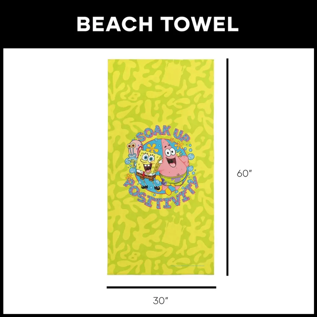 Spread some sunshine and positivity with the Nickelodeon SpongeBob SquarePants "Soak Up Positivity" beach towel. Featuring SpongeBob, Patrick, and Gary, this towel highlights the vibrant colors and fun personalities of the beloved characters. The cheerful design, complete with bubbles and a bright yellow background, makes it an ideal companion for a day at the beach, pool, or anywhere you want to show off your love for Bikini Bottom. Made from soft and highly absorbent fabric, this towel is perfect for drying off after a swim or lounging under the sun. The fun, energetic design encourages positive vibes and good times, making it a must-have for fans of all ages. It’s not just a towel – it’s a celebration of friendship, fun, and laughter. Embrace the joy of SpongeBob and friends with this spirited towel that’s sure to brighten up any beach day or bathroom. With its bold graphics and positive message, it serves as both a functional accessory and a vibrant piece of SpongeBob memorabilia. Perfect for soaking up the sun or adding a playful touch to your collection, this towel is a fun way to show your love for the show!