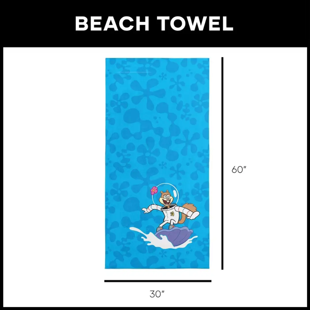Catch the wave of fun with the Nickelodeon SpongeBob SquarePants "Surfing Sandy" beach towel. Featuring the adventurous Sandy Cheeks in her iconic space suit, this towel captures her carefree surfing spirit while riding a giant clam shell. The vibrant design, with bold blue background and splash details, makes it an exciting addition to any beach or pool day, reflecting Sandy's daring attitude and love for the outdoors. Crafted from soft and absorbent fabric, this towel is perfect for drying off after a swim or relaxing in the sun. The colorful and fun design not only celebrates one of Bikini Bottom's most beloved characters but also brings a touch of humor and energy to any outing. Whether you're at the beach, pool, or even just lounging at home, it's a great way to show off your love for the show. Celebrate your passion for SpongeBob and friends with this unique towel that embodies Sandy's adventurous spirit. With its cheerful colors and high-quality material, it’s sure to become a favorite for fans who want to add some excitement and character to their beach gear. Perfect for soaking up the sun or drying off in style, this towel is a must-have for any SpongeBob fan!