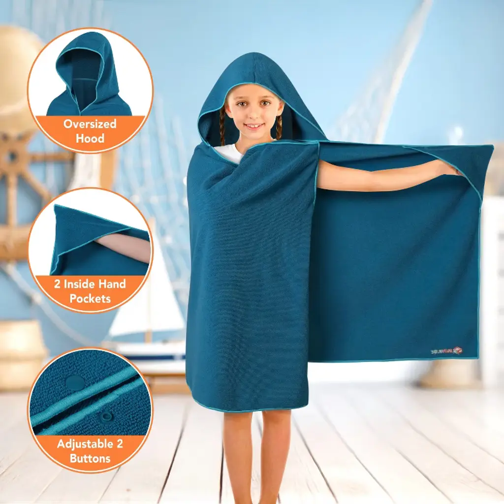 Kids Hooded Bath Towel Large Oversized 30"x 60", Absorbent Quick Dry Soft Microfiber Wearable Wrap Swim Shower Pool Beach Towel Pullover for Boys Girls Toddler Age 3-9 Years by Sun Cube HOODED TOWELS FOR BATH BEACH: Large oversized bath towel that fits most boys girls ages 3-9 years old and measures 30 x 60 inches. Surf pullover wrap is quick drying with a large hood to keep head and body dry and warm after swim, bath, and surfing beach session PERFECT FIT FOR TODDLER AND KIDS: Pullover towel is adjustable with 2 buttons design and 2 inside hand pockets that makes it easy to grab and wrap blanket towel around full body to keep warmth SOFT & ABSORBENT Our pullover towel for kids is made of 100% premium microfiber polyester that is soft, breathable and lightweight. Our swim towel pullover is fully absorbent and dries quickly after a shower, bath, swimming or surfing while keeping your child cozy, warm, and dry SWIM, SURF,& HOME USE - This beach towel with hood is versatile and can be used as a beach towel wrap or coverup for boy girls. It is also soft and absorbent for use at home after a shower or bath and for travelling and camping. A warm comfortable hood helps to shade your child from sun and rain making this ideal for any outdoor conditions EASY TO CARE & Machine washable in cold water, tumble dry low and do not bleach. Easy to fold and pack making it portable and compact for travel. This swim towel pullover for kids is a must have summer accessory for the beach, shower, pool party and vacation. This beach towel makes a perfect gift idea for young swimmers, surfers, and beach camping lovers About SunCube At Sun Cube, we offer premium products that protect our customers in the sun and allow them to achieve and perform better in any outdoor activities. Our products are meticulously designed with the finest materials and functions, making them versatile and functional at the same time.