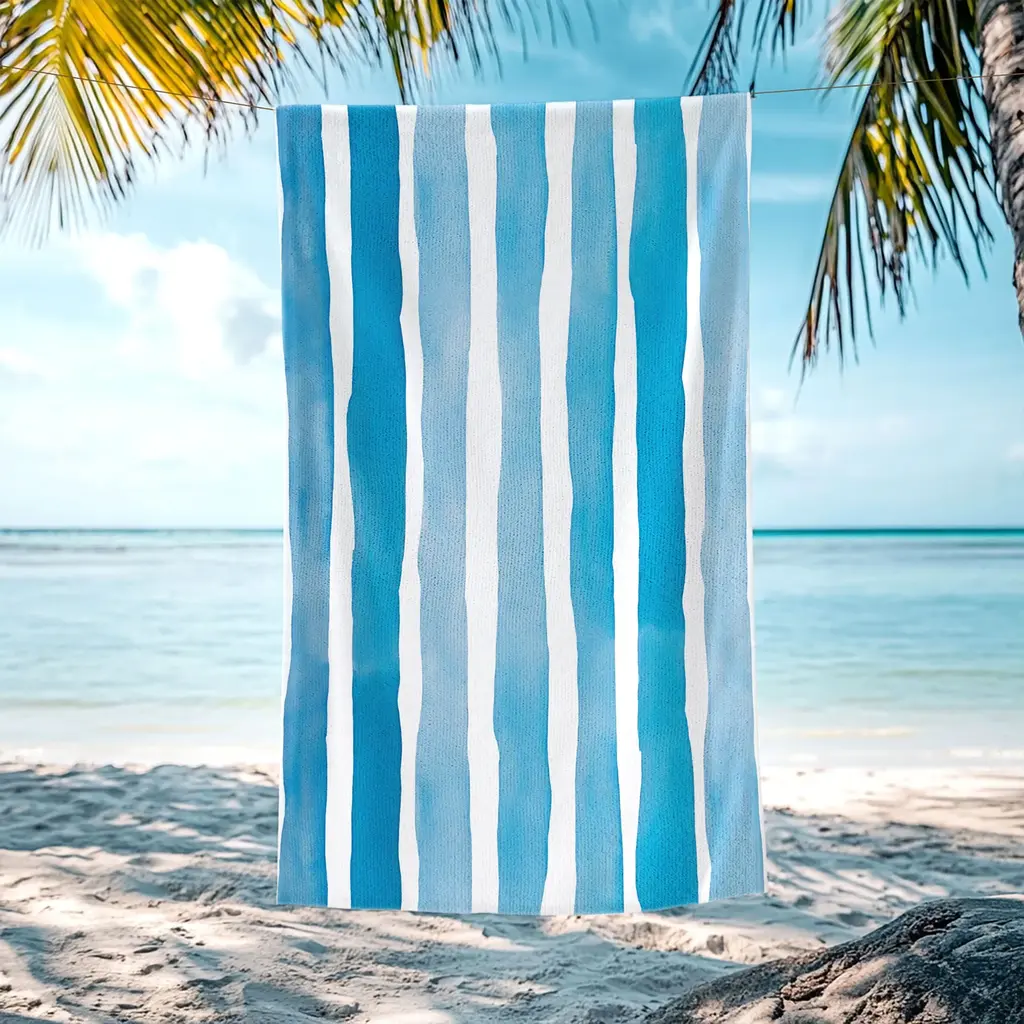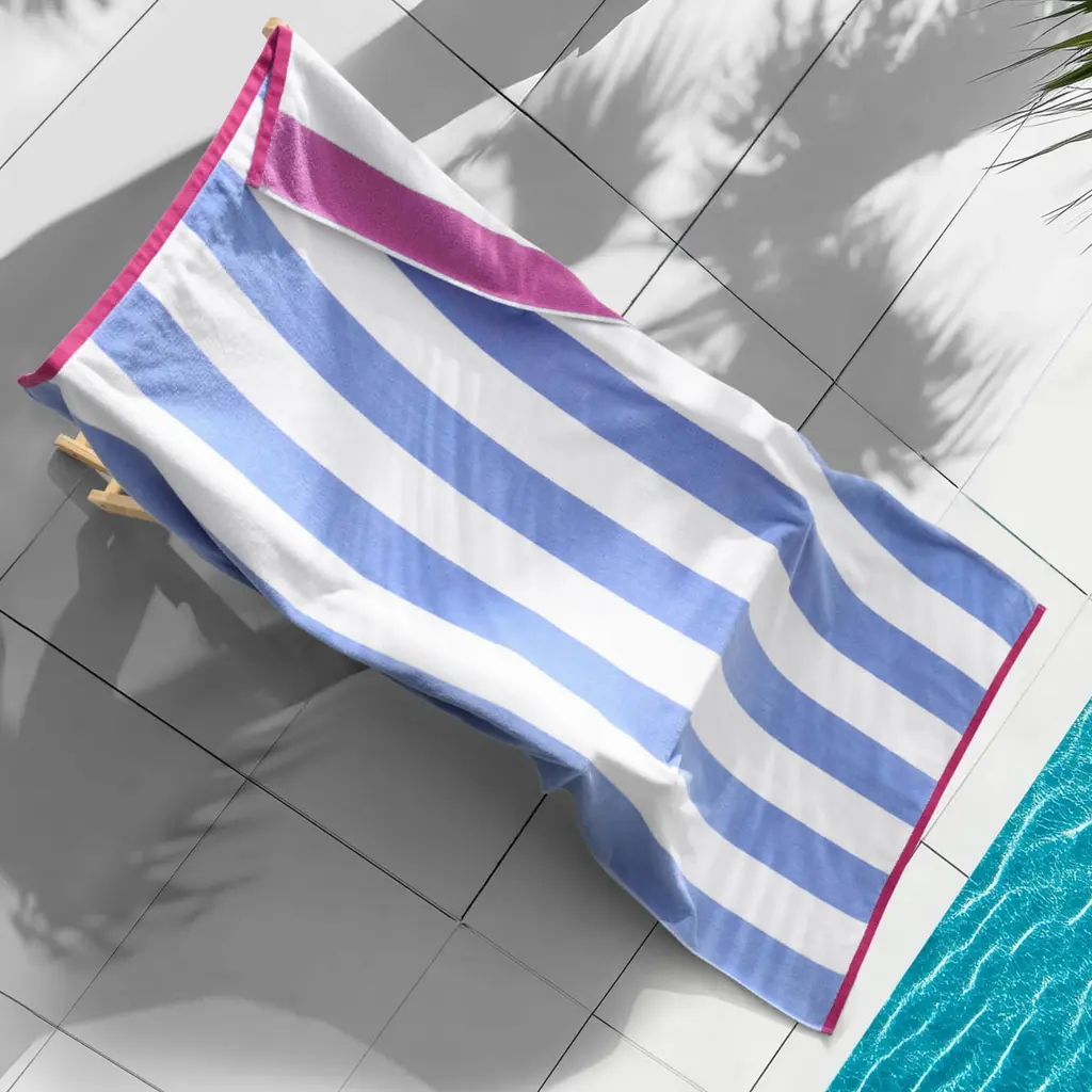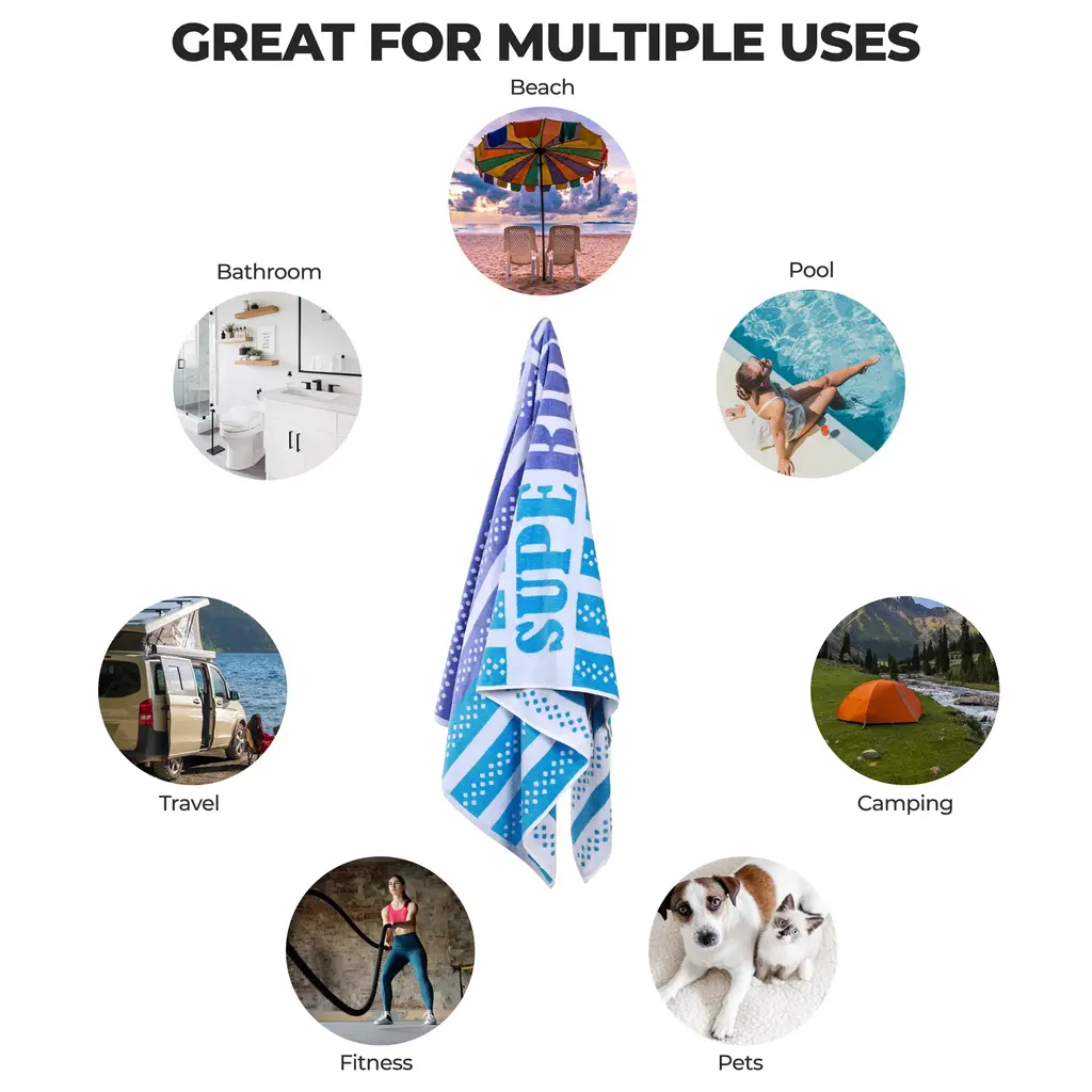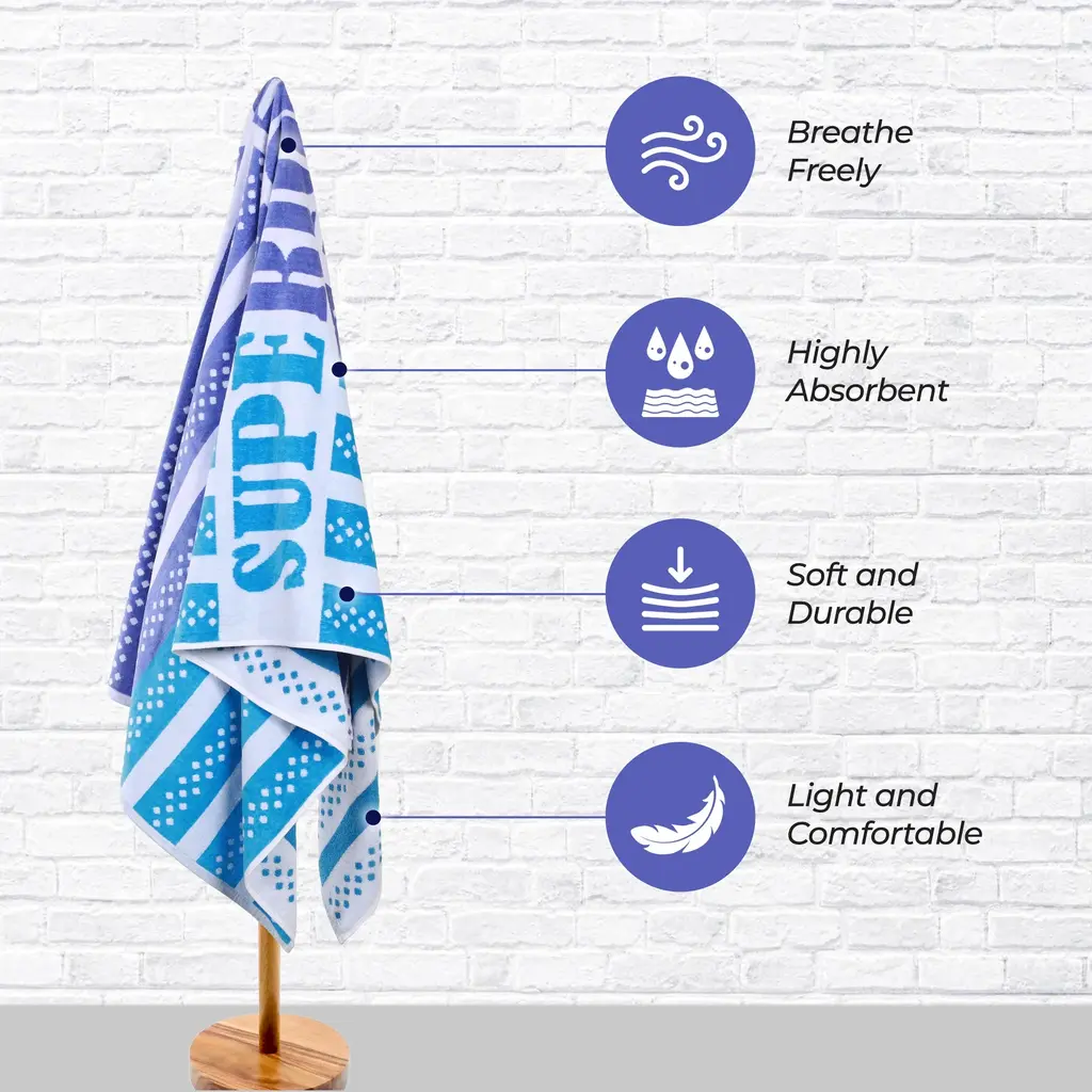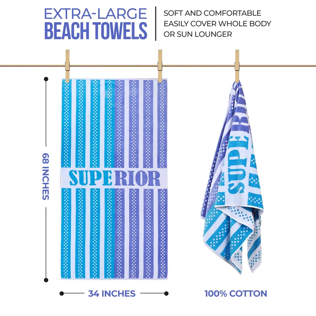 Coordinate your beach style with the eye-catching look and cozy feel of the Superior Striped Cotton Beach Towel. This vibrant towel is made from ultra-soft cotton and features absorbent terry on one side and plush velour on the reverse to repel water and sand. Each towel is oversized to keep you warm and dry after swimming or sunbathing. These colorful towels fold up compactly to fit into any beach bag or suitcase. Ideal for travel, you can carry this towel camping, keep it poolside, or decorate your bathroom in style. Featuring a colorful striped pattern in warm or cool tones with "Superior" in the center, these beach towels are versatile and perfect for fun in the sun.Features: