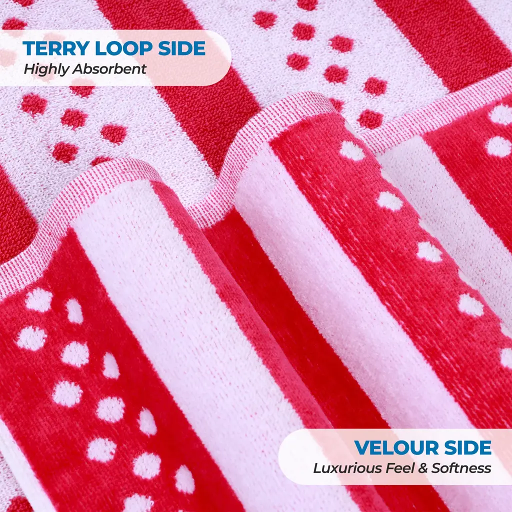 Coordinate your beach style with the eye-catching look and cozy feel of the Superior Striped Cotton Beach Towel. This vibrant towel is made from ultra-soft cotton and features absorbent terry on one side and plush velour on the reverse to repel water and sand. Each towel is oversized to keep you warm and dry after swimming or sunbathing. These colorful towels fold up compactly to fit into any beach bag or suitcase. Ideal for travel, you can carry this towel camping, keep it poolside, or decorate your bathroom in style. Featuring a colorful striped pattern in warm or cool tones with "Superior" in the center, these beach towels are versatile and perfect for fun in the sun.Features: