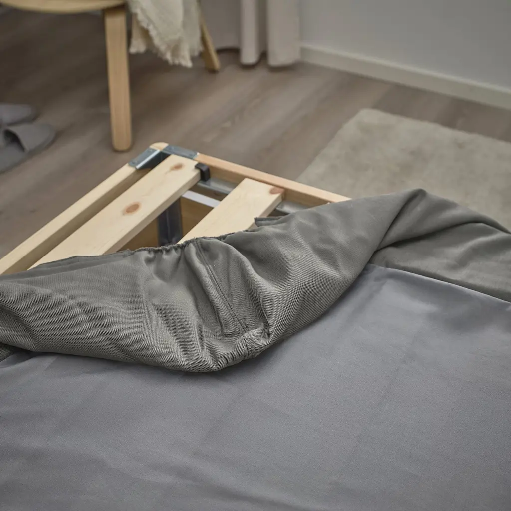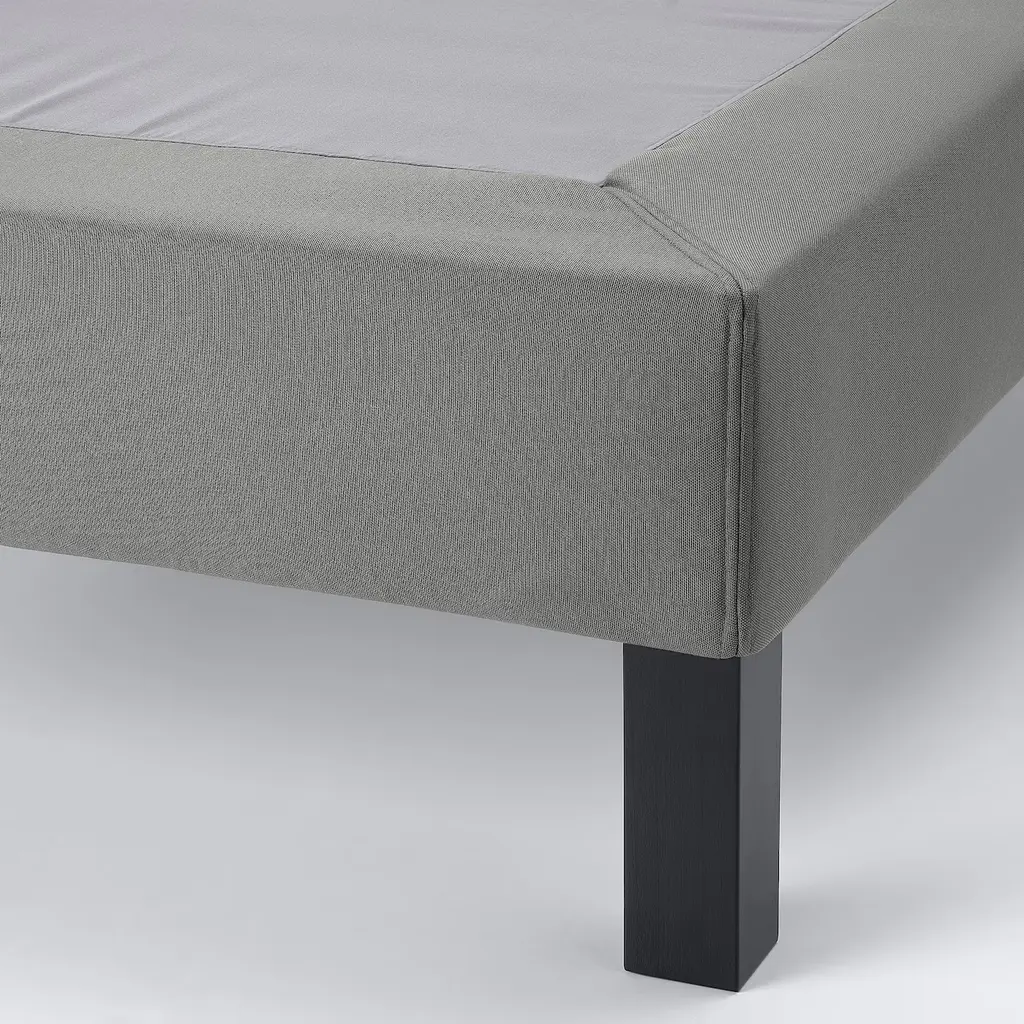 LYNGÖR Slatted mattress base with legs - dark gray Queen. LYNGÖR bed base has flat slats for an even and uniform foundation for the mattress. The bed base has a removable cover that can be machine washed. The assembly of the bed base is simple and quick.