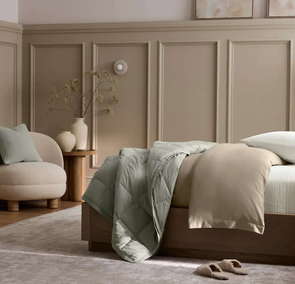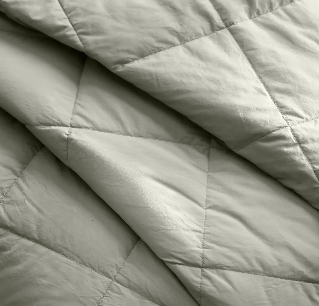 Warmer than a quilt and lighter than a duvet, this bed blanket is our most versatile layering staple. It’s made with our down fill that’s ethically sourced from farms in the U.S. and triple washed to guarantee a cleaner, longer-lasting loft. Both soft and breathable, the durable down-proof shell is made from the highest quality 100% organic cotton threads. The linear design features a quilted bafflebox construction that keeps the fill perfectly in place, and is finished with decorative details. The Feel Soft & smooth with quilted dimension The Look Classic with clean lines for an understated aesthetic