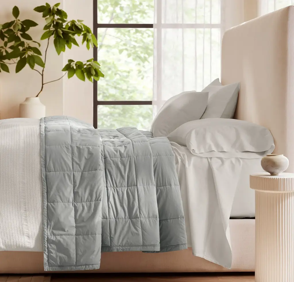 Warmer than a quilt and lighter than a duvet, this bed blanket is our most versatile layering staple. It’s made with our down fill that’s ethically sourced from farms in the U.S. and triple washed to guarantee a cleaner, longer-lasting loft. Both soft and breathable, the durable down-proof shell is made from the highest quality 100% organic cotton threads. The linear design features a quilted bafflebox construction that keeps the fill perfectly in place, and is finished with decorative details. The Feel Soft & smooth with quilted dimension The Look Classic with clean lines for an understated aesthetic