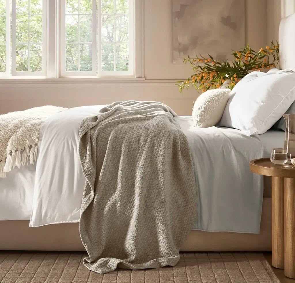 This Bed Blanket's modern interpretation of the classic crochet stitch pairs a smooth-yet-intricate texture with the softest all-season design. Woven with the finest 100% organic cotton by artisans in Portugal, this layer is crafted with a dual-yarn knit—one softly twisted, one tightly spun—to strike the perfect balance between dimension and drape. The result is an inviting, garment-washed blanket that brings sculptural contrast to the bed. The Feel Lived-in softened with a breathable weight The Look Heirloom-inspired dimension with a soft drape