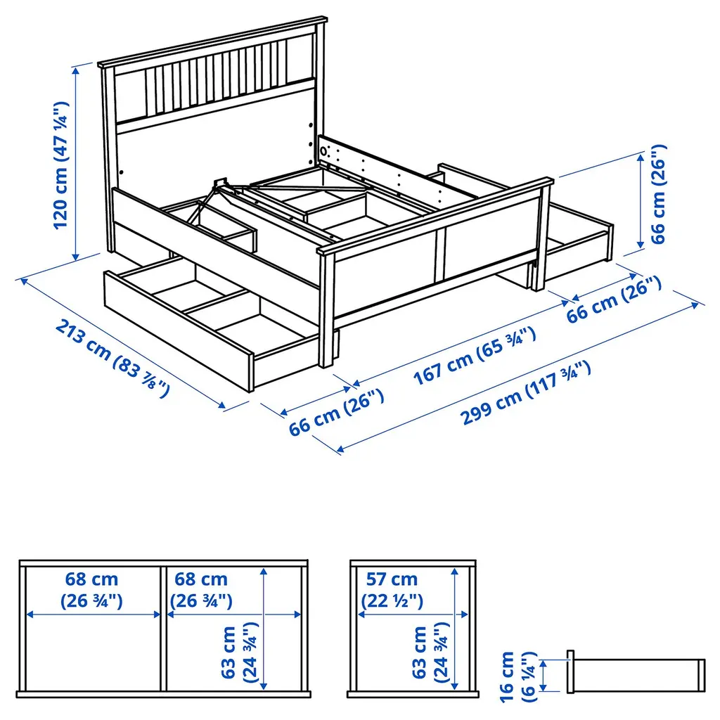 HEMNES Bed frame with 4 storage boxes - white stain/Luröy Queen. Practical storage for an extra pillow, comforter or bedspread. Made of solid wood, which is a durable and warm natural material. Adjustable bed sides allow you to use mattresses of different thicknesses.